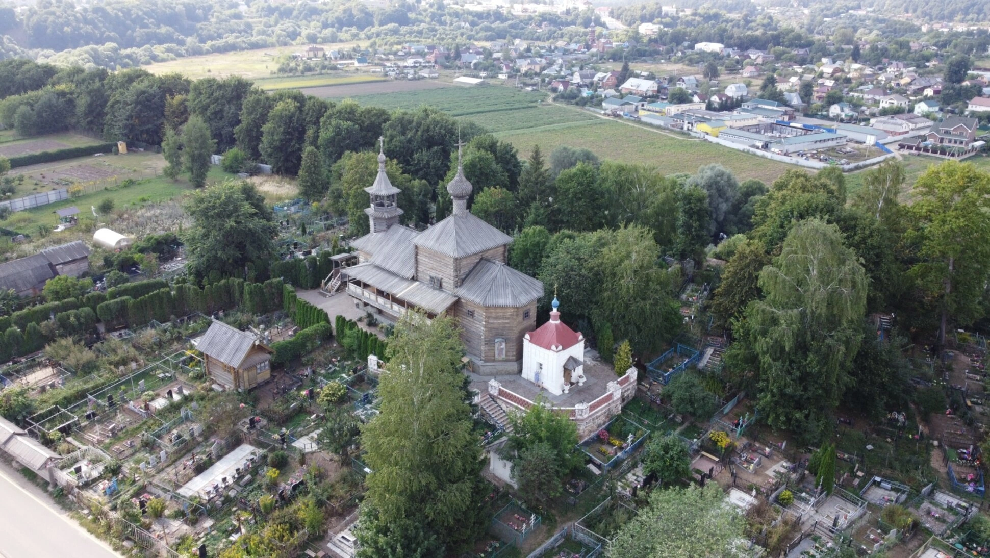 На представленной фотографии запечатлён уникальный памятник русского деревянного зодчества и православной духовности — Церковь Покрова Пресвятой Богородицы, что расположена на историческом месте под названием Высокое в древнем городе Боровске Калужской области. Храм живописно возвышается на холме, доминируя в окружающем ландшафте и являясь неотъемлемой частью панорамы старинного русского города.