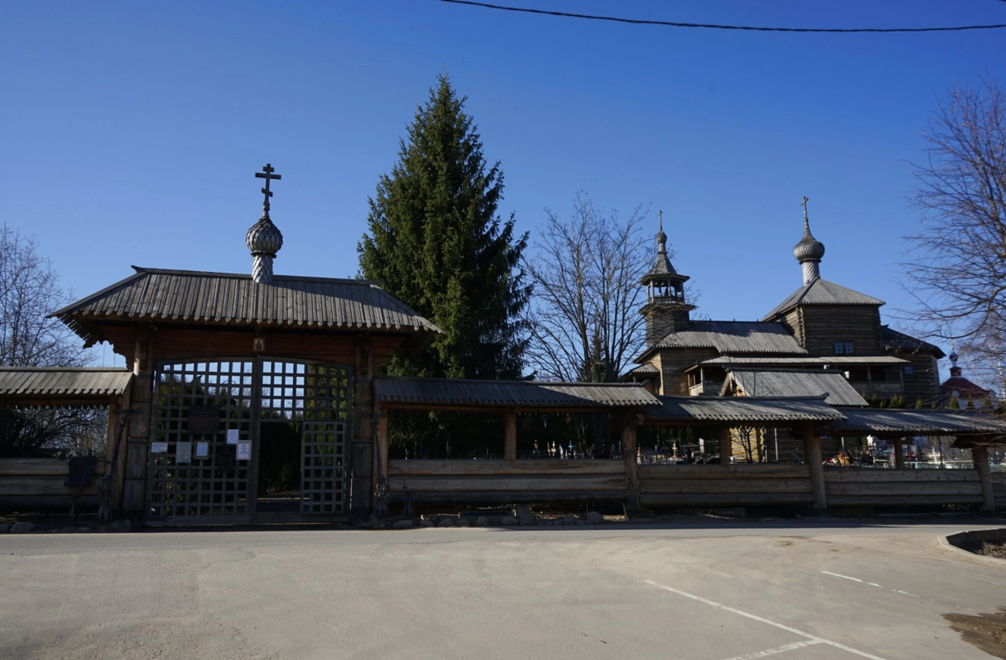 На фотографии запечатлена Церковь Покрова Пресвятой Богородицы на Высоком, расположенная в городе Боровске Калужской области. Этот уникальный храм представляет собой выдающийся памятник русского деревянного зодчества XVII века, сохранившийся до наших дней как единственный в Калужской области деревянный храм данного исторического периода.