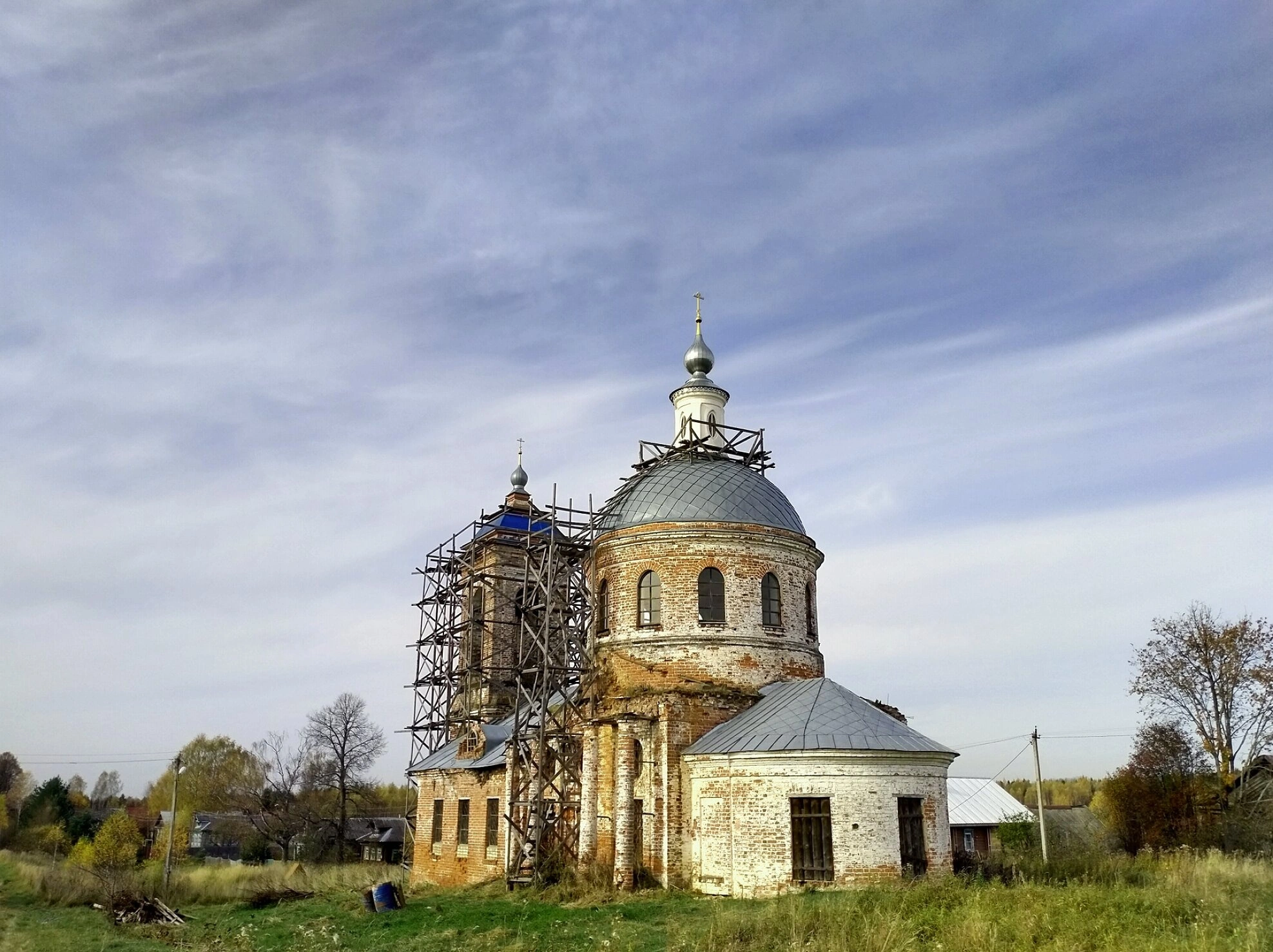 Снимок передаёт не только архитектурные детали, но и атмосферу места. Храм стоит в сельской местности, окружённый высокой травой и деревьями с осенней листвой. Серые облака на небе и общее состояние здания, в котором величие исторической формы сочетается с видимыми следами разрушения, вызывают чувство светлой печали и надежды на возрождение. Фотография не содержит изображений людей, крупным планом запечатлён сам архитектурный памятник и его природное окружение.