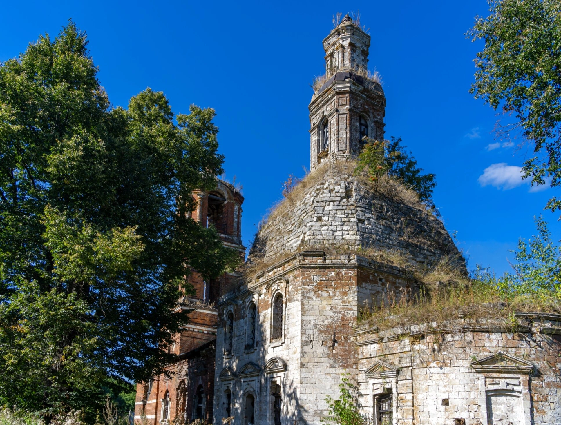 Окружающий пейзаж, запечатлённый в летний или ранний осенний день, добавляет в картину особый melancholicчный настрой. Храм стоит в окружении деревьев с густой листвой, а над ним простирается чистое голубое небо, символизирующее вечность и надежду на возрождение. Лучи солнца, падающие на древние стены, высвечивают каждую трещину и каждый след времени, делая зримым путь скорби и забвения, по которому прошёл этот памятник духовной истории.