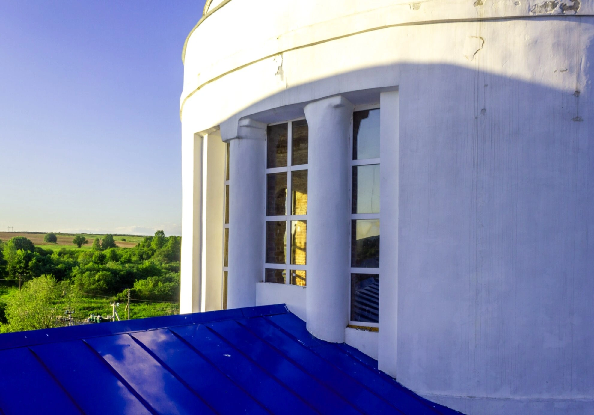Между колоннами расположены высокие арочные окна, предназначенные для освещения подкупольного пространства и внутреннего убранства храма. Их строгие прямоугольные формы и чёткие линии контрастируют с мягкими округлостями барабана, создавая гармоничный архитектурный образ. В нижней части кадра виден фрагмент синей металлической кровли, покрывающей основной четверик храма.