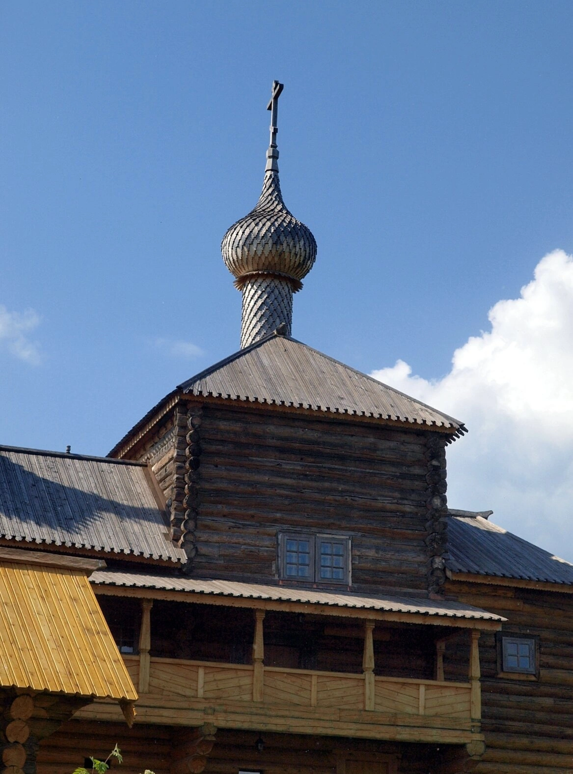 На фотографии запечатлена Церковь Покрова Пресвятой Богородицы, расположенная в городе Боровске Калужской области. Этот православный храм является выдающимся образцом русского деревянного зодчества и обладает особой духовной и исторической ценностью. Архитектура храма характерна для традиционного церковного строительства Центральной России: бревенчатые стены, аккуратная кровля и изящный луковичный купол, увенчанный крестом, символизирующим веру и спасение.
