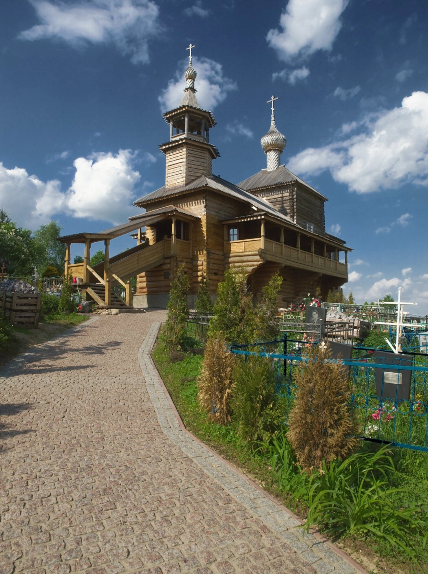 К центральному входу в церковь ведёт аккуратно вымощенная камнем дорожка, обрамлённая ухоженными декоративными кустарниками. По сторонам виднеется фрагмент ограды, за которой расположено старинное церковное кладбище — место упокоения многих поколений прихожан.