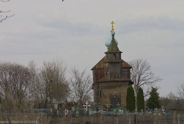Храм возвышается на территории городского кладбища, что является исторической традицией для многих древних погостов. Его архитектурный облик характерен для традиционного деревянного храмостроения: четверик, увенчанный луковичным куполом, на котором гордо установлен православный крест, символ победы жизни над смертью. Снимок, сделанный в 2005 году фотографом Денисом Жуковым, передаёт атмосферу благоговейной тишины и вечного покоя, свойственную этому священному месту.