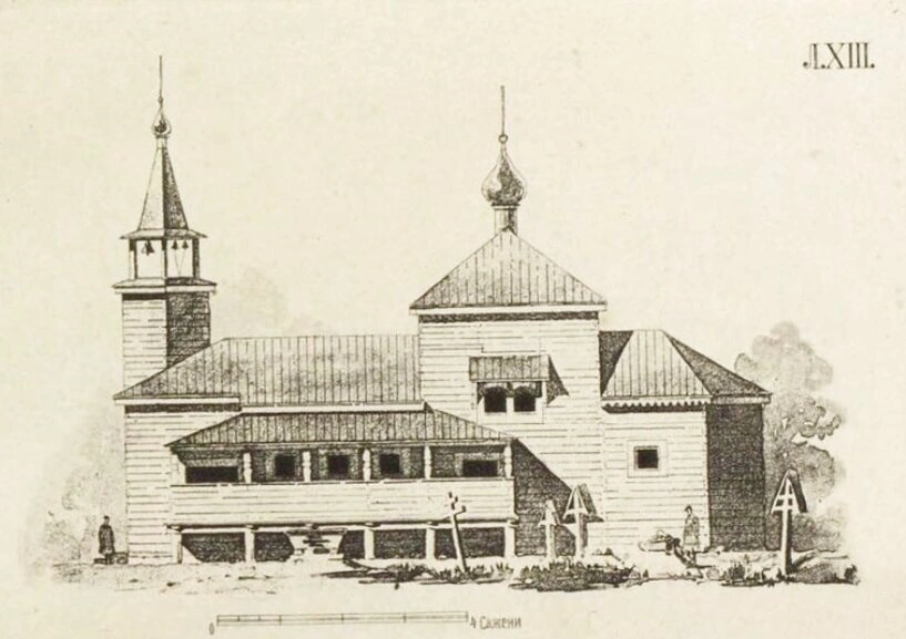 Вокруг святой обители изображён церковный погост с намогильными крестами, а также окружающий храм природный ландшафт с деревьями. Наличие масштабной линейки с надписью «А Сажени» и номера «LXIII» в углу указывает на то, что данное изображение могло быть частью серьёзного архитектурного альбома или научного труда, посвящённого изучению национального зодчества.