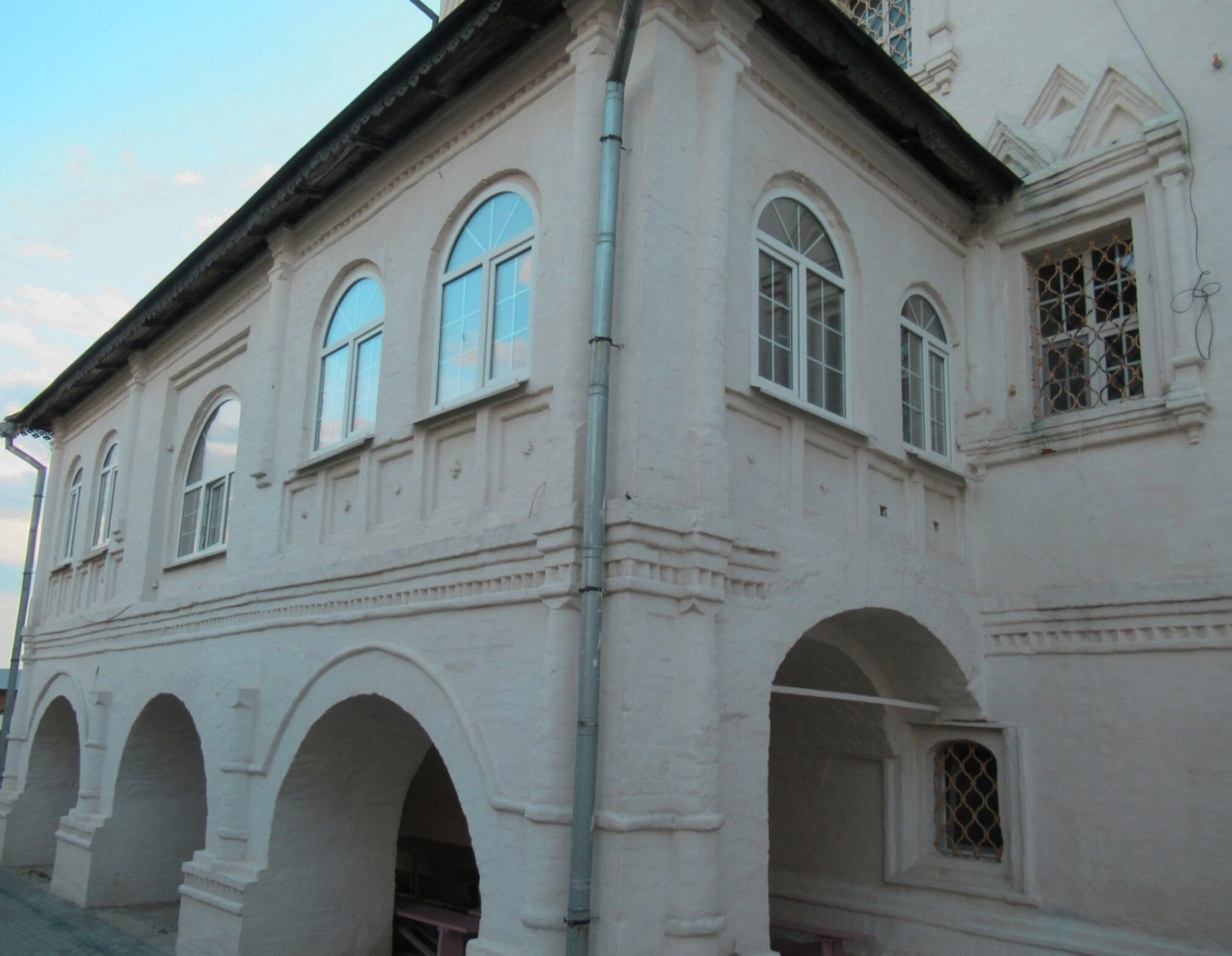 Белокаменный фасад храма украшен арочными оконными проемами, характерными для русского церковного строительства. Нижний ярус здания обрамляет открытая галерея с низкими сводчатыми арками, которые опираются на массивные каменные колонны. Эта архитектурная особенность придает сооружению особую монументальность и величие.