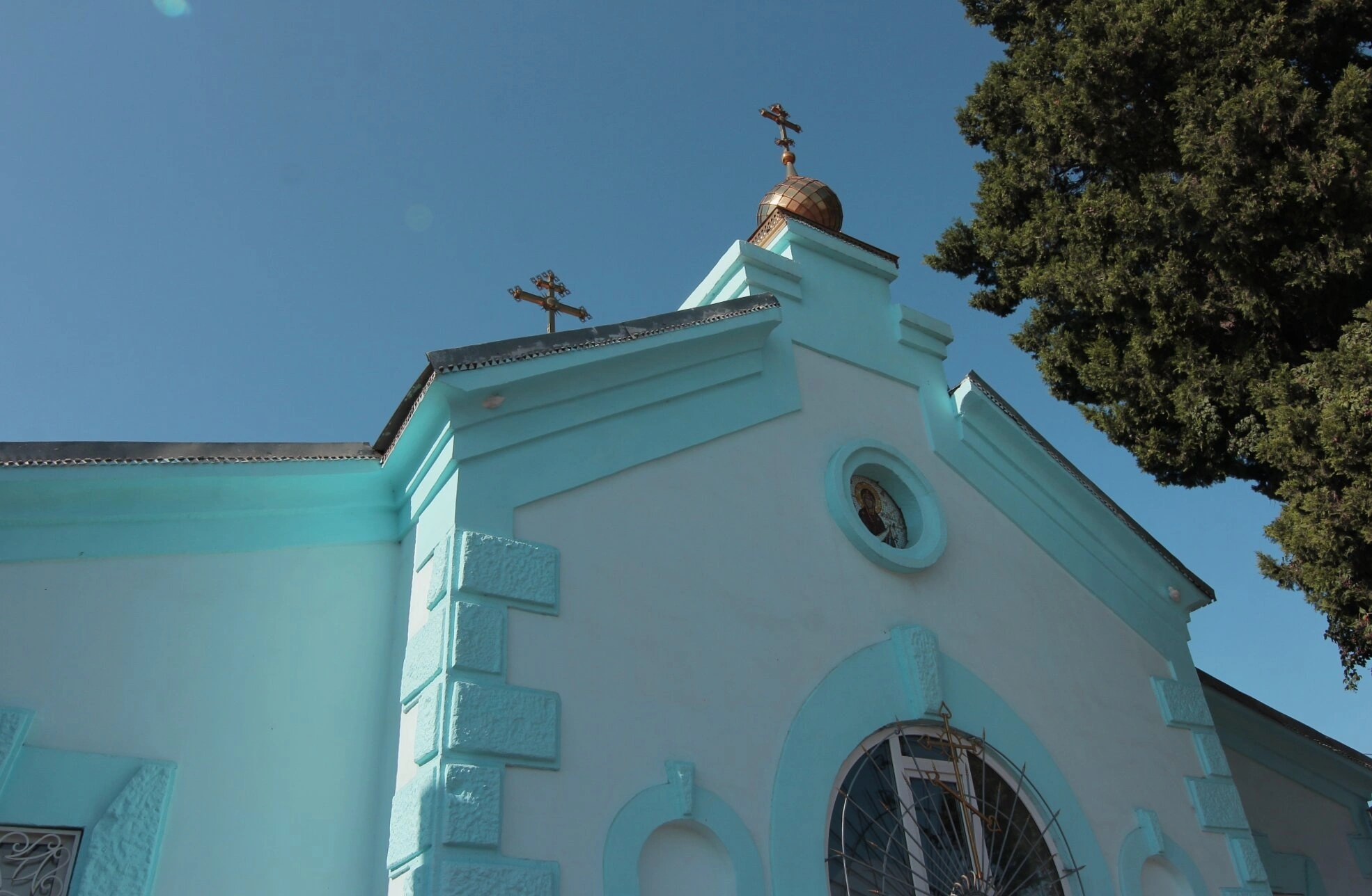 Центральный фасад украшает крупное круглое окно-розетка, в котором размещена почитаемая икона. Ниже расположено арочное оконное проёмство, обрамлённое каменной кладкой и защищённое кованой решёткой. С правой стороны от храма виднеется крона раскидистого зелёного дерева, что придаёт месту особый мирный и благостный вид, гармонично сочетая творение рук человеческих с творением природы.