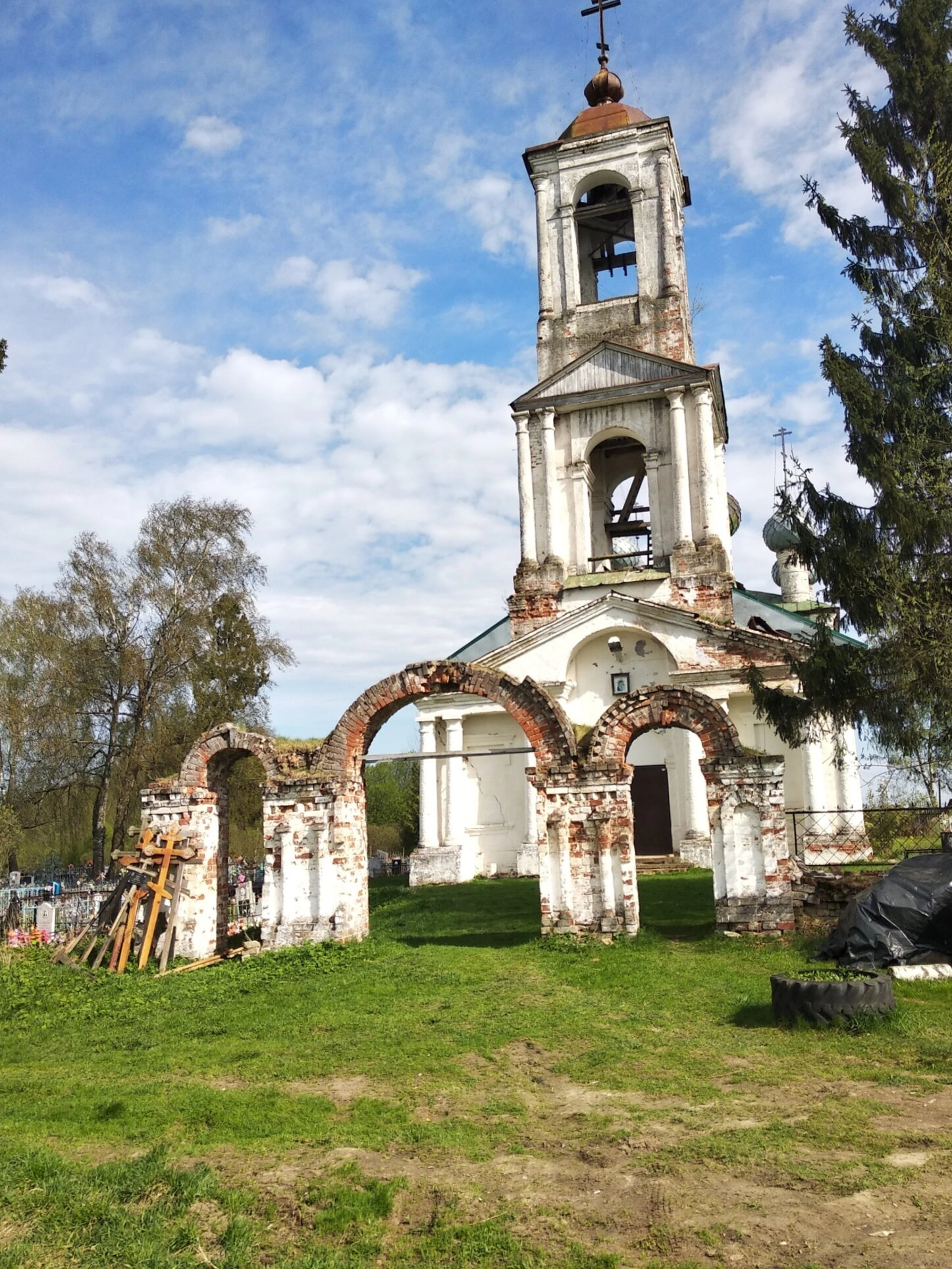 Здание церкви выполнено в стиле классицизма, характерном для русской храмовой архитектуры конца XVIII - начала XIX веков. На снимке хорошо просматривается основное белокаменное здание с сохранившимся куполом, а также высокая двухъярусная колокольня, увенчанная православным крестом. Колокольня демонстрирует характерные для классицизма строгие пропорции и лаконичный декор.