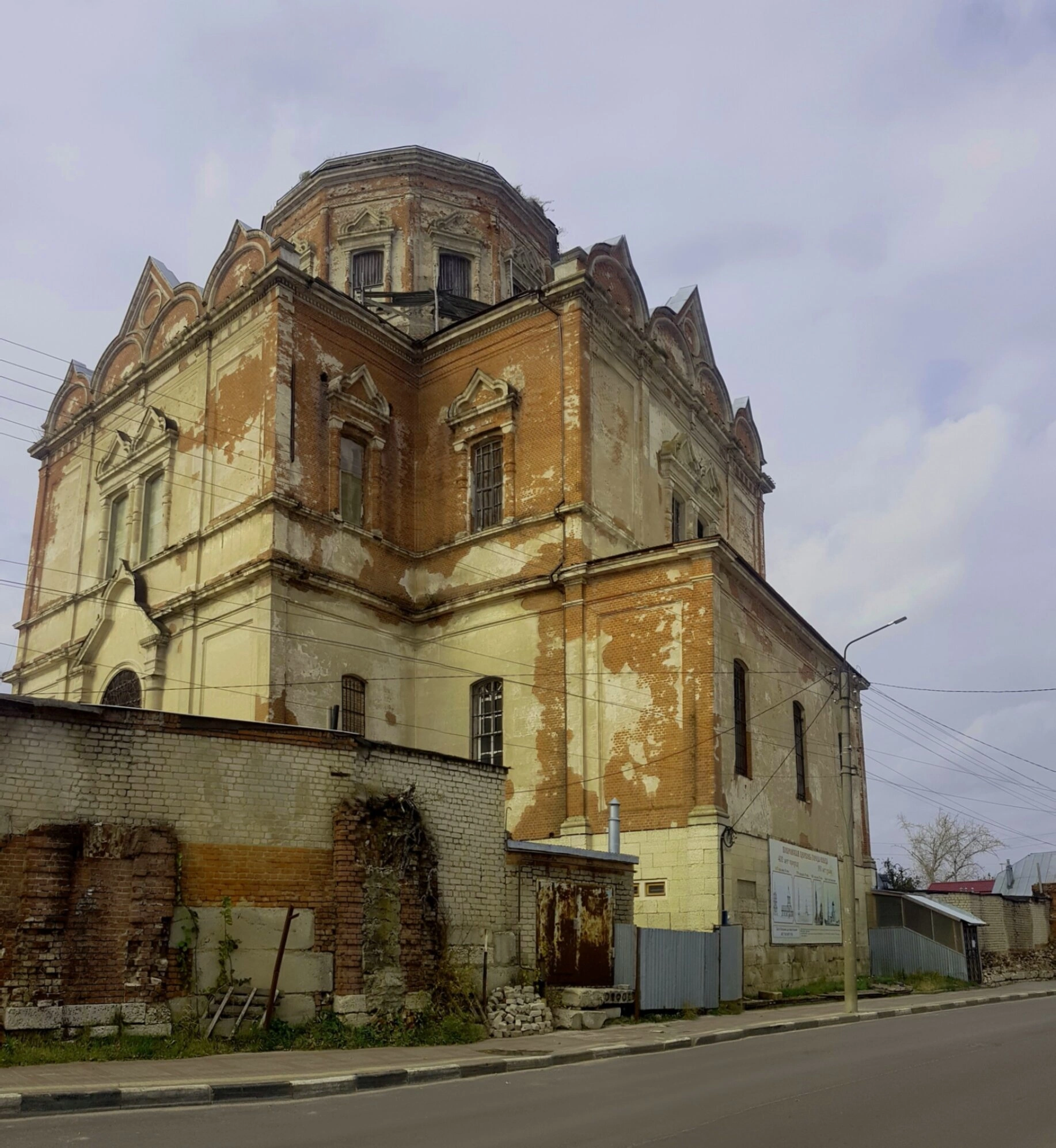 На фотографии можно наблюдать кирпичный оштукатуренный фасад храма, который, к сожалению, находится в состоянии, требующем благочестивой заботы и реставрационных работ. Видны следы времени: местами обветшала кирпичная кладка, отслоилась штукатурка, что не умаляет благодатной красоты и величия этого дома Божия. Несмотря на внешние повреждения, храм сохраняет свою величественность и продолжает быть объектом культурного и духовного наследия.
