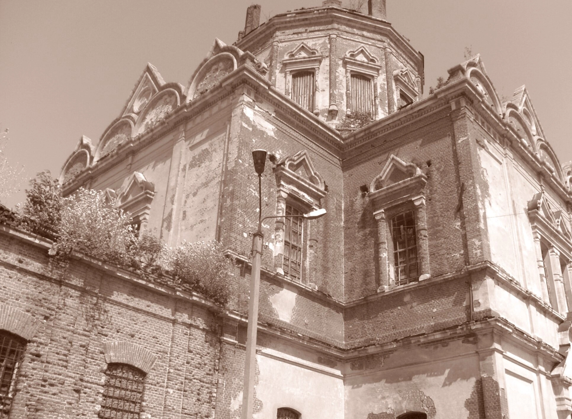 К сожалению, в настоящее время святыня пребывает в заброшенном состоянии, что видно по осыпающейся штукатурке, повреждённой кирпичной кладке и растительности, прорастающей на стенах и кровле. Тонирование снимка в сепию подчёркивает историческую ценность памятника и его благородное величие, несмотря на запустение.