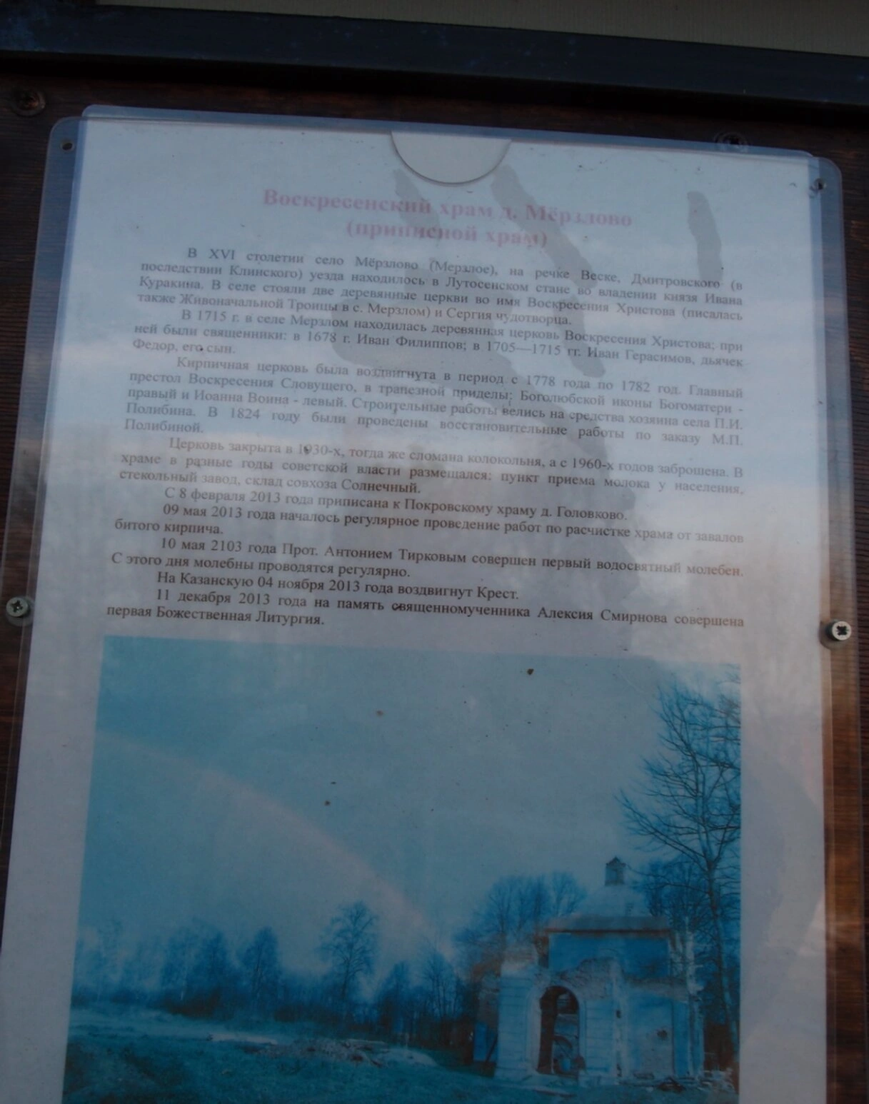 На представленной фотографии запечатлен информационный стенд, посвященный истории Воскресенского храма в деревне Мерзляни Московской области. Данный стенд содержит подробное историческое описание и изображение храма, что представляет значительный интерес для паломников и исследователей православного наследия.