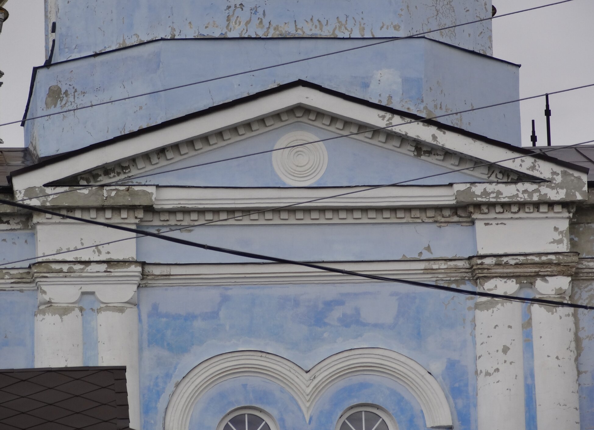 В нижней части фасада расположены два арочных окна, обрамлённые белым декором, что характерно для православных храмов, где свет символически играет важную роль в богослужебной жизни. На поверхности стен заметны следы облупившейся краски, что свидетельствует о возрасте сооружения и его исторической ценности, напоминая о необходимости сохранения духовного и культурного наследия.