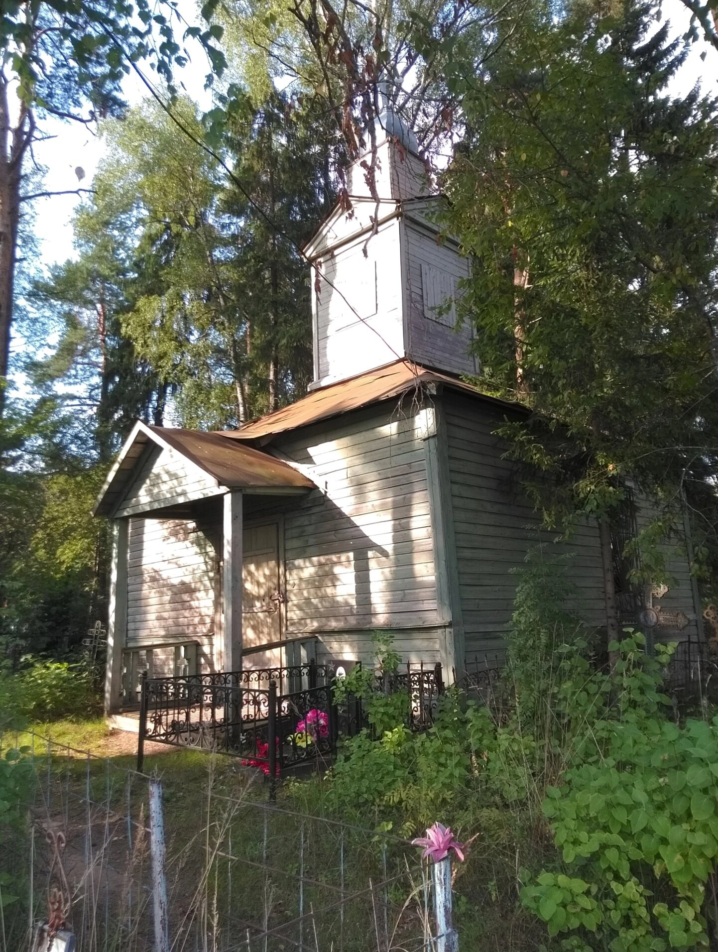 Храм расположен в уединённом живописном месте, окружённый высокими деревьями с пышной листвой. Территория вокруг церкви ухожена, перед храмом просматривается фрагмент кованой ограды с характерными узорами и низкий забор. На переднем плане фотографии видны полевые цветы в траве, что создаёт особую атмосферу духовного умиротворения и гармонии с природой.