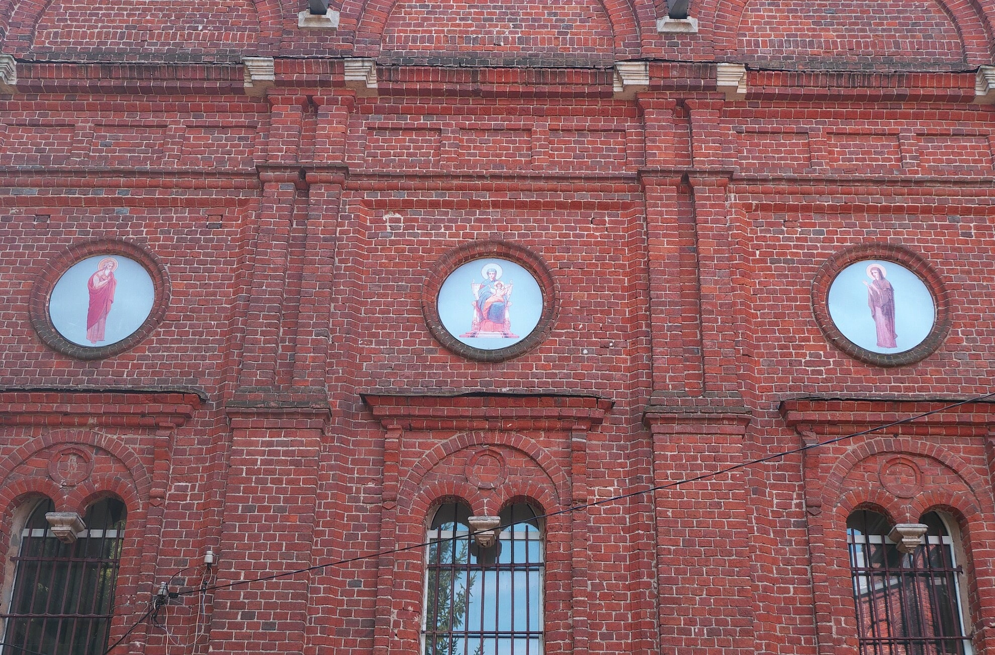 Ниже святых образов расположены три арочных оконных проёма, обрамлённые кирпичными наличниками и защищённые коваными металлическими решётками. На фасаде заметны элементы современной инфраструктуры – электропроводка, проложенная вдоль стены храма.
