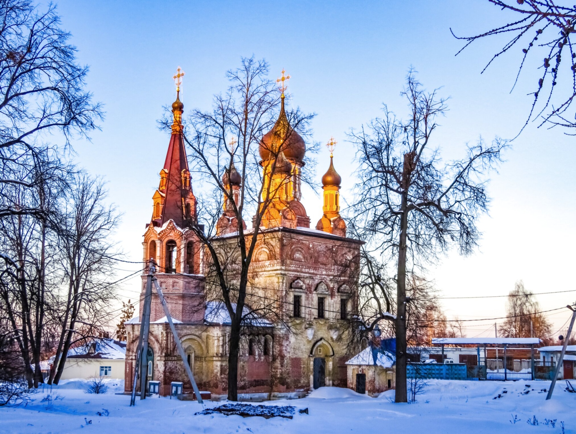 Белоснежный покров, окутавший землю и кровлю храма, подчёркивает строгую красоту кирпичных стен и изящество архитектурных форм. Оголённые ветви деревьев, окружающих церковь, образуют естественный узорчатый фон, сквозь который проступает ясное небо. Это безмолвное и умиротворённое зрелище наполнено тихой, созерцательной радостью, характерной для православного зимнего пейзажа.