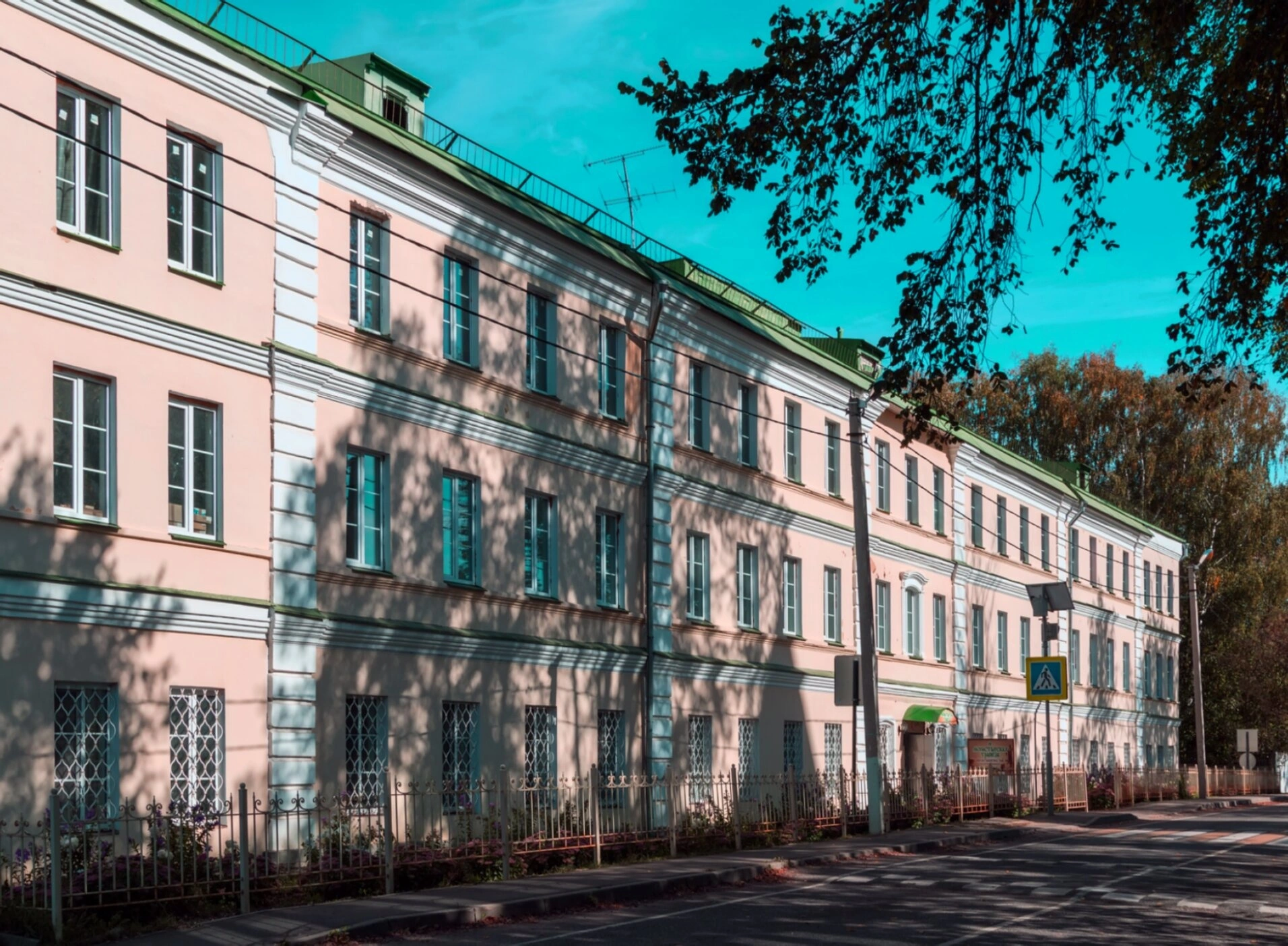 На фотографии хорошо просматриваются элементы благоустройства территории вокруг храма, включая ограждение и пешеходные подходы. Зелёные насаждения, частично обрамляющие здание, подчёркивают единство творения Божия и рук человеческих. Присутствие антенн на крыше свидетельствует о современном обустройстве храма, необходимом для его нормального функционирования в современных условиях.
