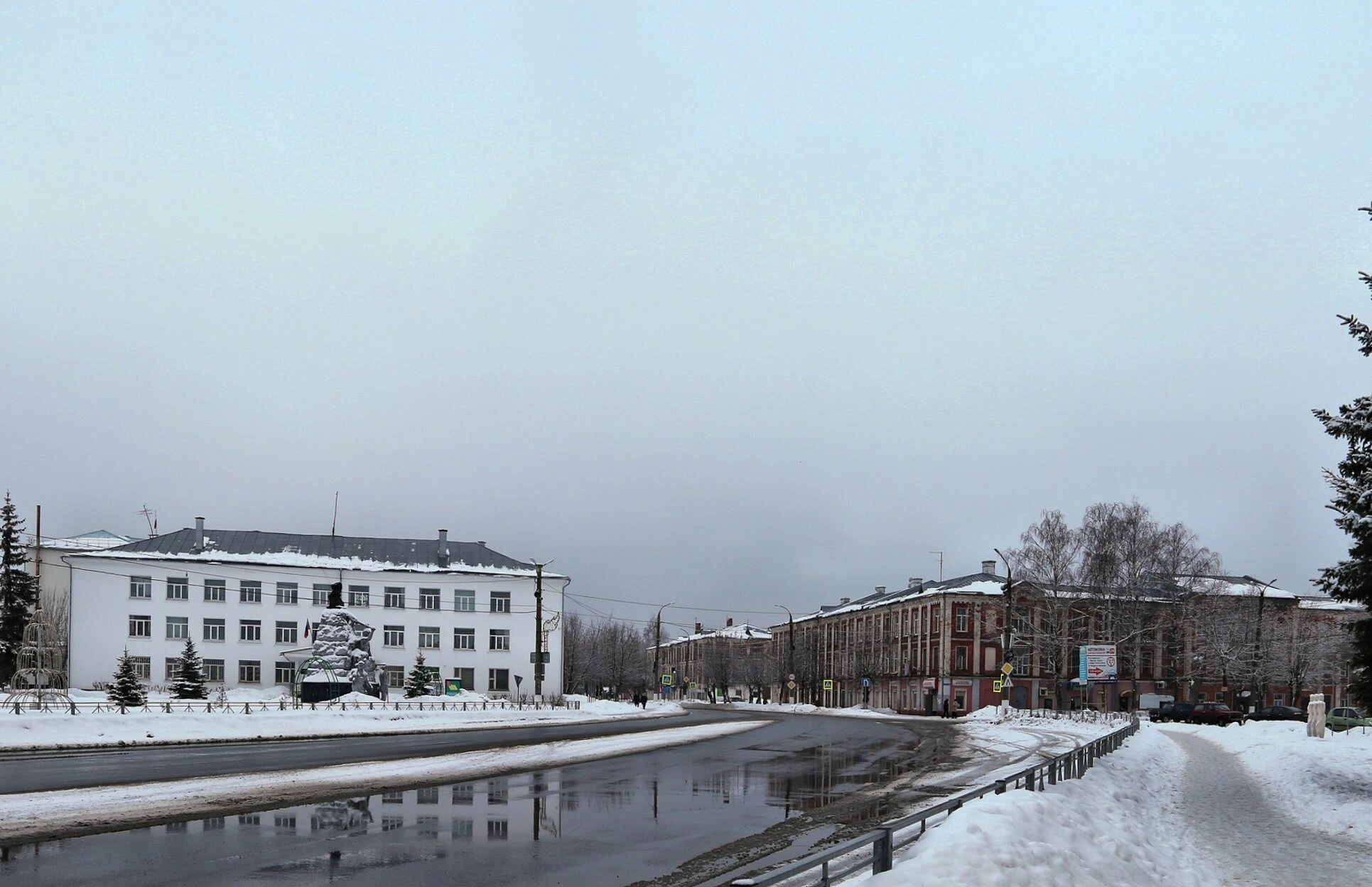 По сторонам от центрального строения расположены дополнительные сооружения: справа видно деревянное здание с двускатной крышей, слева — голые ветви деревьев и линии электропередач. Пасмурное зимнее небо усиливает общее впечатление от фотографии, подчёркивая состояние забвения, в котором пребывает этот памятник православной культуры.