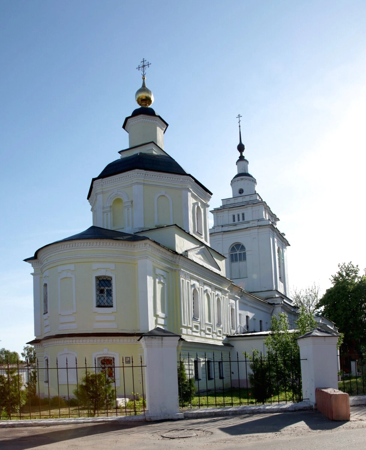 Белоснежный храм с тёмными куполами, увенчанными златоглавыми крестами, ярко выделяется на фоне ясного неба. Его архитектурный облик характерен для русского церковного зодчества конца XVIII — начала XIX веков. Основной объём церкви завершается мощным световым барабаном, над которым возвышается главный купол с позолоченной главкой и крестом. Ансамбль гармонично дополняет трёхъярусная колокольня со шпилем, которая служит высотной доминантой комплекса.