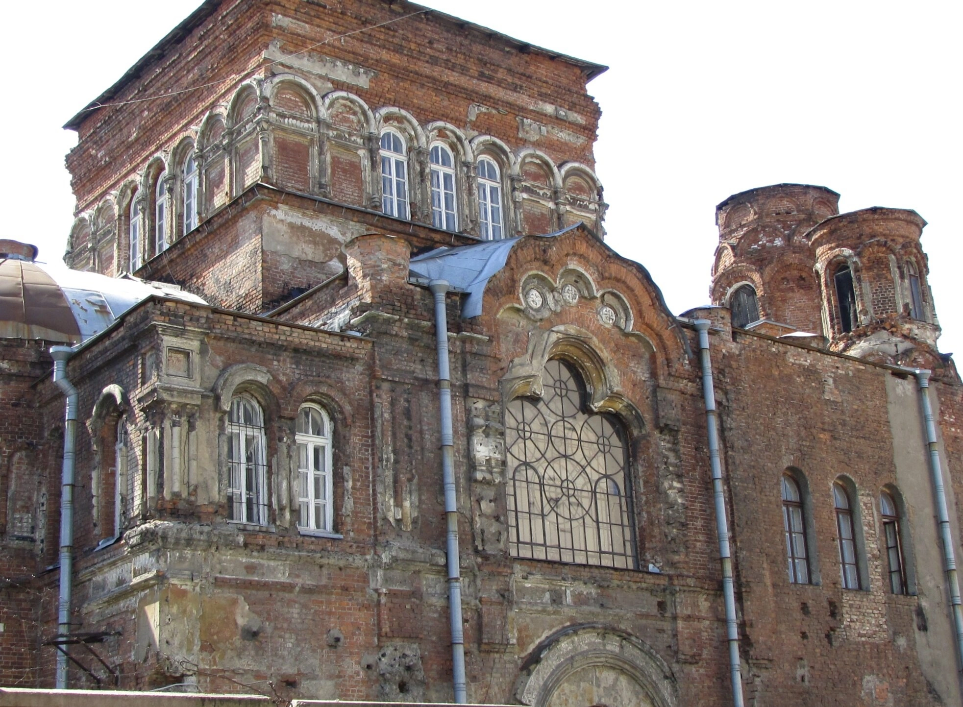 На снимке хорошо просматривается кирпичный фасад храма, выполненный из красного кирпича с изящными декоративными элементами из тёсаного камня. Чётко видны арочные оконные проёмы, характерные для культовых построек, а также детали убранства: ширинки, киотцы и колонки, придающие облику здания торжественность и благолепие. Фотография позволяет оценить строгую красоту и величие этого духовного центра, являющегося объектом культурного наследия России.
