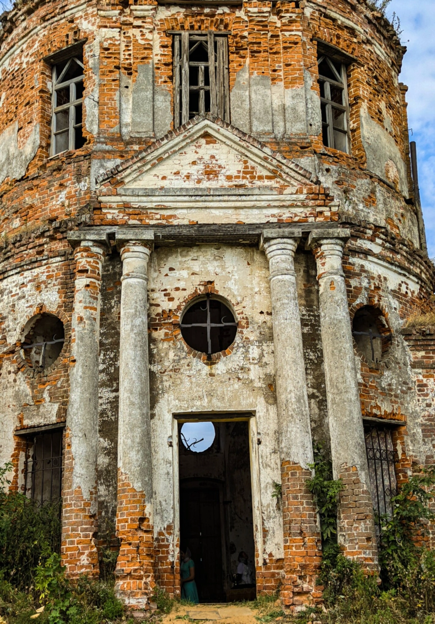 Основание храма постепенно скрывается под зарослями травы и кустарника, что подчёркивает длительное запустение святыни. На нижнем уровне сохранились фрагменты первоначальной белой штукатурки. В дверном проёме просматриваются силуэты людей, что позволяет оценить масштаб сооружения.