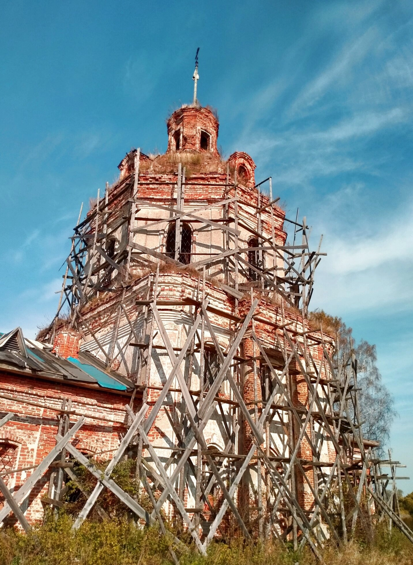 На представленной фотографии запечатлена Церковь Покрова Пресвятой Богородицы, расположенная в селе Алферьево Переславского района Ярославской области. Святыня находится в состоянии, требующем немедленного восстановления, о чём свидетельствуют многочисленные строительные леса, окружающие её стены. Эти конструкции установлены для предотвращения дальнейшего разрушения и проведения консервационных работ.