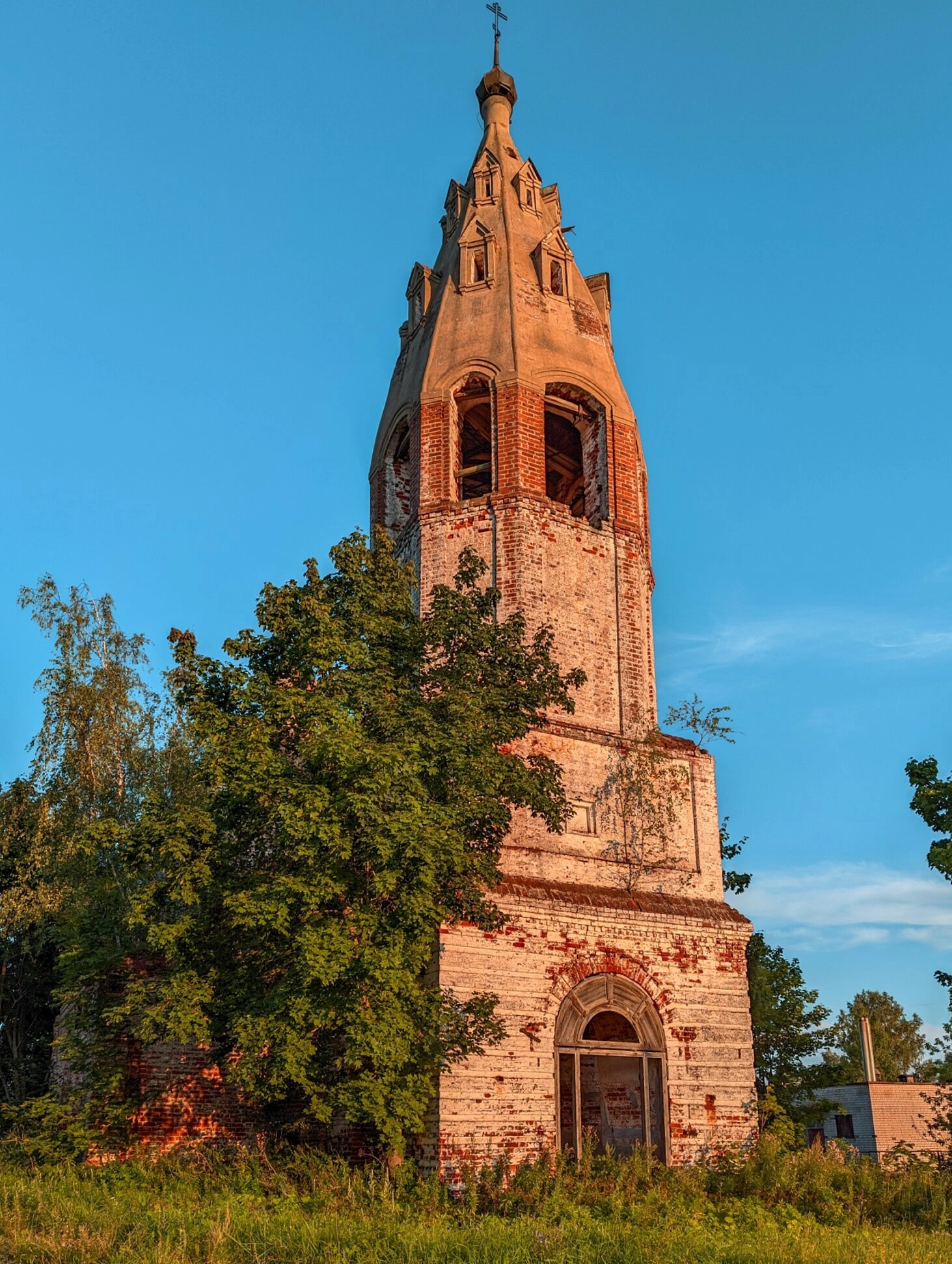 Многоярусная колокольня с арочными проёмами гордо устремляет свой шпиль с воздвигнутым крестом ввысь, к ясному голубому небу, символизируя неугасимую надежду на милость Божию. Окружённая густой зелёной растительностью, включая деревья и высокую траву, церковь выглядит умиротворённо и несколько меланхолично, гармонично вписываясь в природный ландшафт.