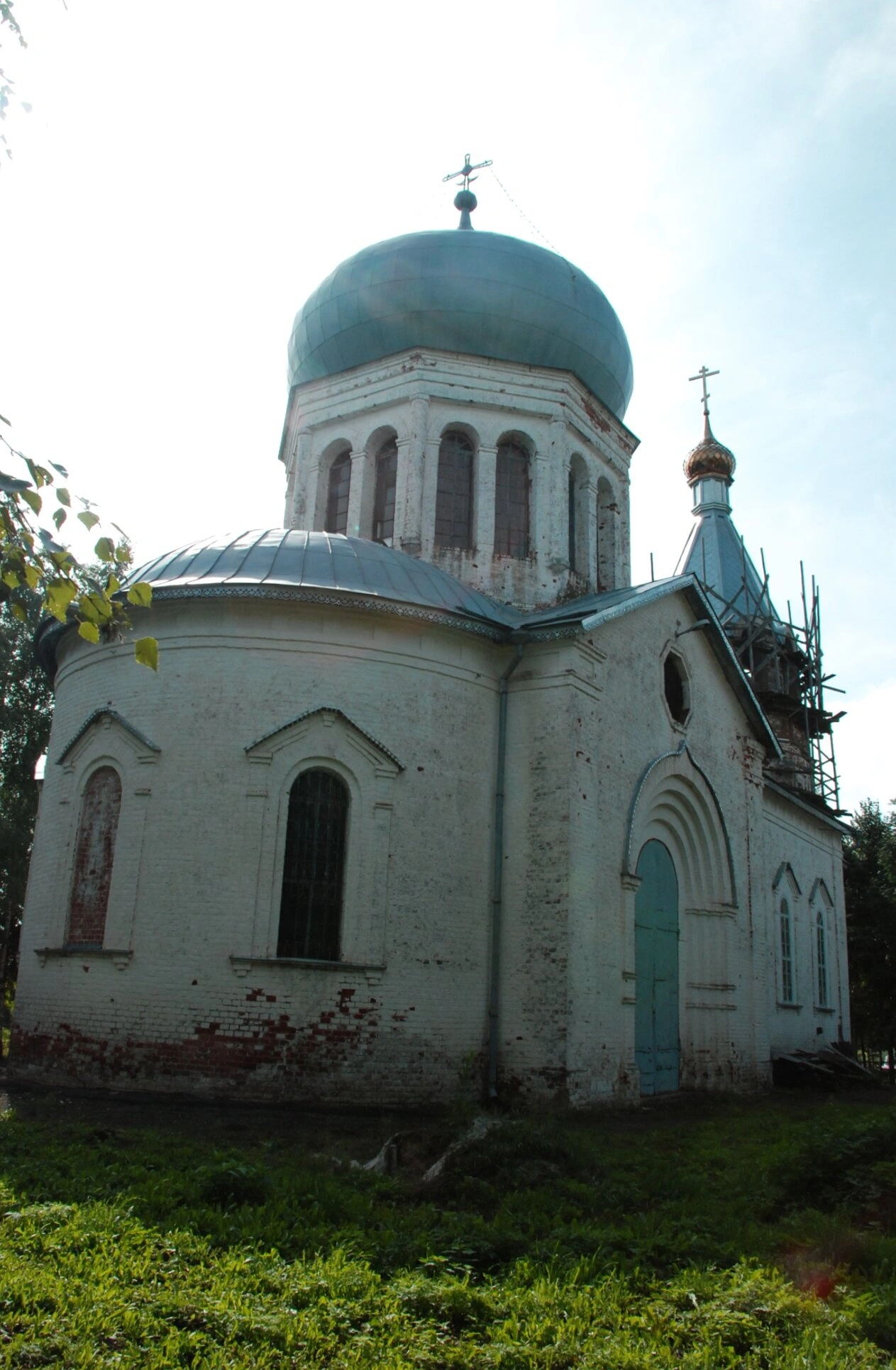 Фотография позволяет рассмотреть детали кирпичной кладки и форму купола, характерные для храмового зодчества конца XIX – начала XX века. Вид реставрационных лесов вселяет надежду на то, что этот памятник православной культуры обретает новую жизнь и в скором времени вновь будет открыт для молитвы и поклонения верующих. Местоположение храма на живописном берегу позволяет ему гармонично вписываться в окружающий природный ландшафт, создавая единый молитвенный образ с творением Божиим.