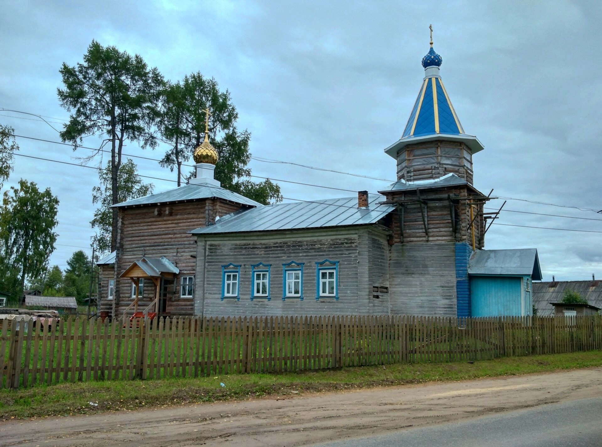 Территория вокруг храма огорожена деревянным забором, отделяющим священное пространство от мирской суеты. На заднем плане фотографии виднеются скромные деревенские постройки и хвойные деревья, характерные для природы Архангельской области, что подчёркивает гармоничное единение храма с окружающим ландшафтом.
