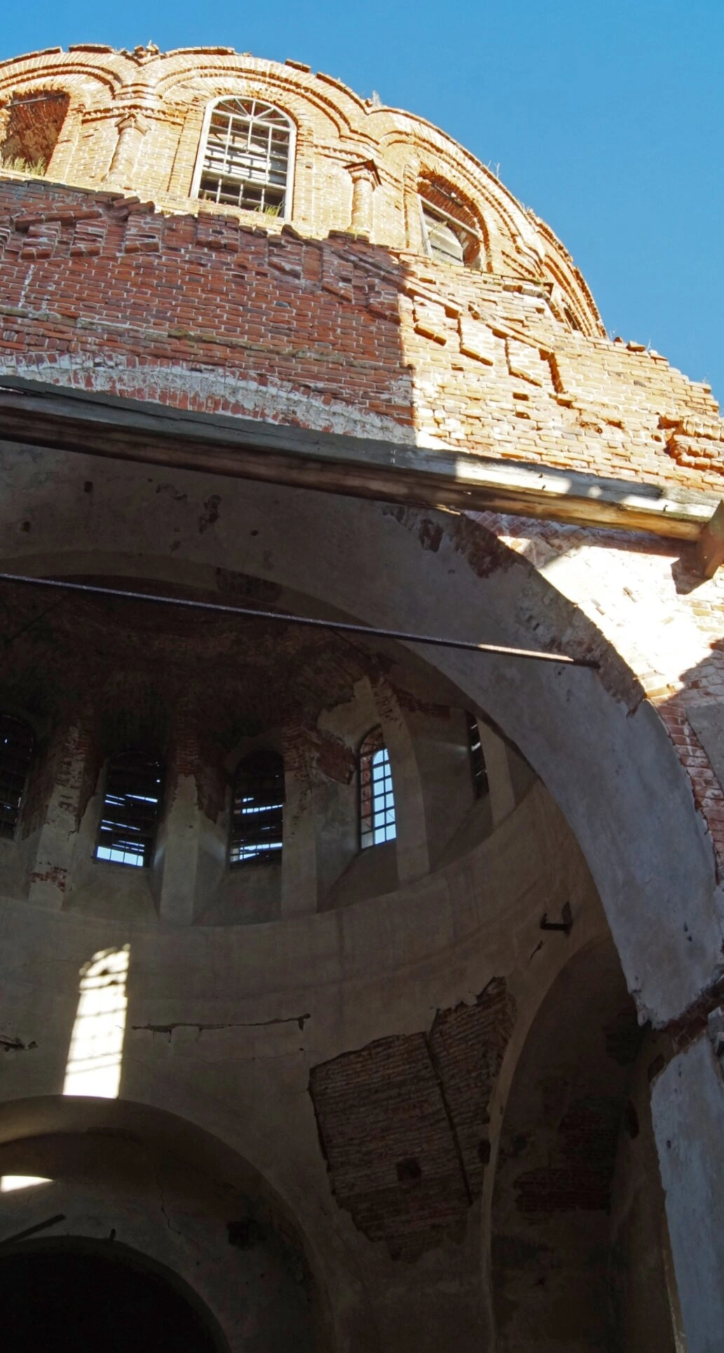 Фасад храма украшают арочные оконные проёмы и перспективные порталы, ныне зияющие пустотой. Отсутствие стёкол и дверей, а также следы времени на стенах красноречиво говорят о нынешнем запустении этого некогда благодатного места. Несмотря на разруху, сооружение сохраняет величественный и строгий облик, напоминая о былом духовном предназначении.