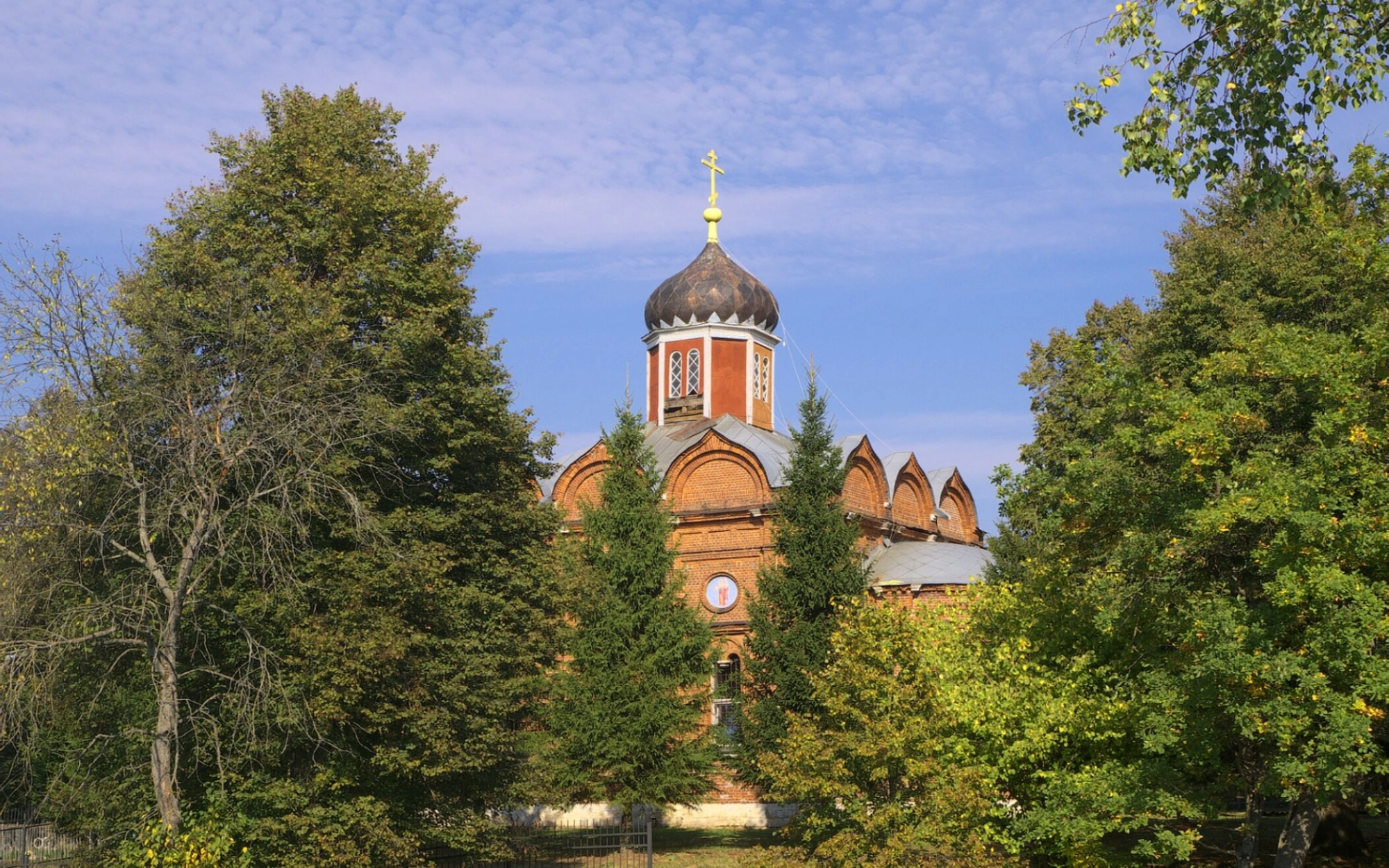 Территория вокруг церкви благоустроена и ограждена металлической оградой. Архитектурный ансамбль органично вписан в природный ландшафт: храм окружают деревья с осенней листвой золотистых и багряных оттенков, а на переднем плане виднеются хвойные деревья, вероятно, ели, которые частично обрамляют фасад. На заднем плане открывается вид на голубое небо с легкими облаками, что придает снимку особую светозарность.