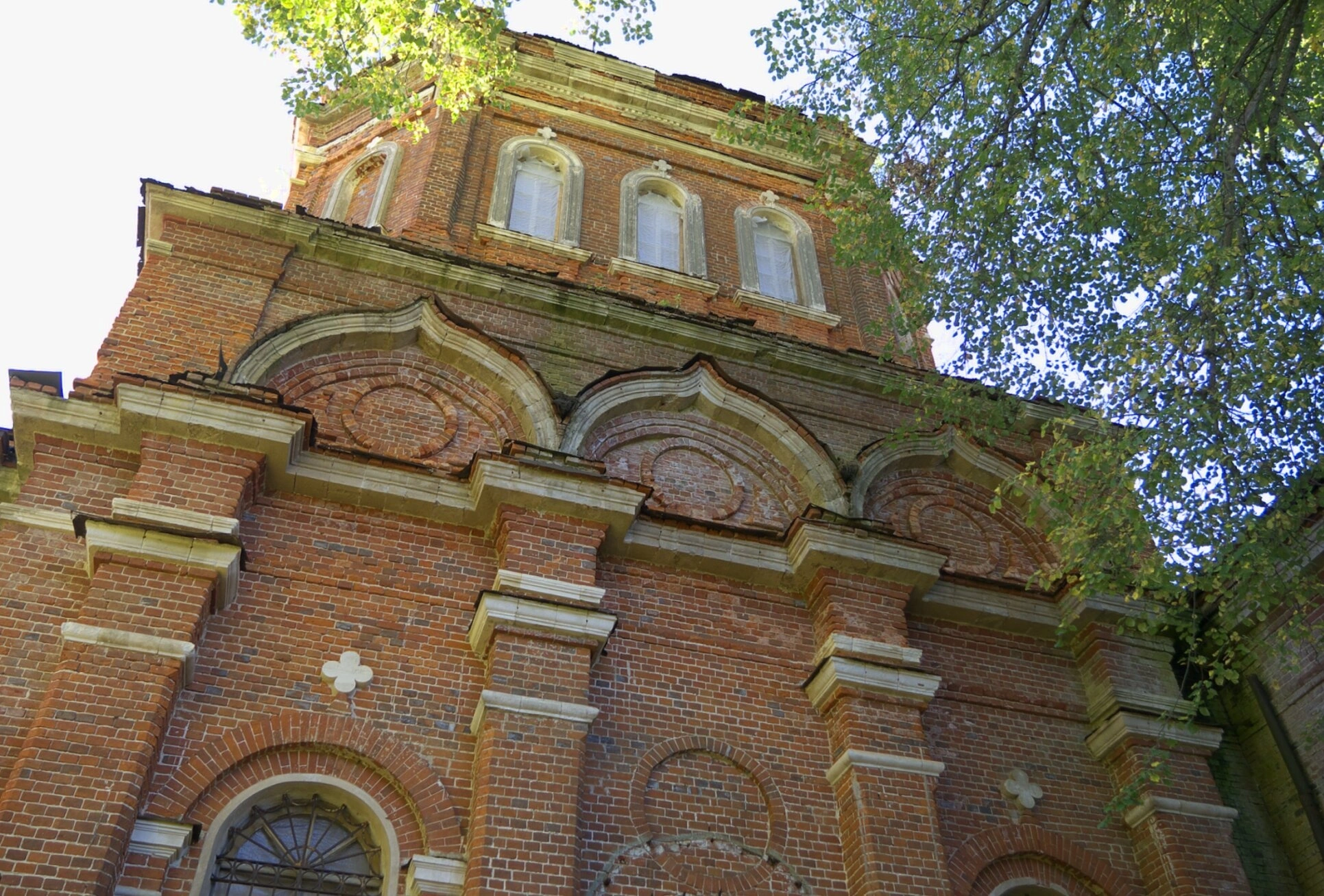 Храм выполнен из красного кирпича в псевдорусском стиле, который был характерен для периода эклектики. На снимке хорошо просматривается богато украшенный фасад здания с декоративными кокошниками, арочными оконными проёмами и изящными колоннами, что придаёт сооружению неповторимый облик и торжественность. Церковь венчают традиционные луковичные главы, возносящиеся к небу.