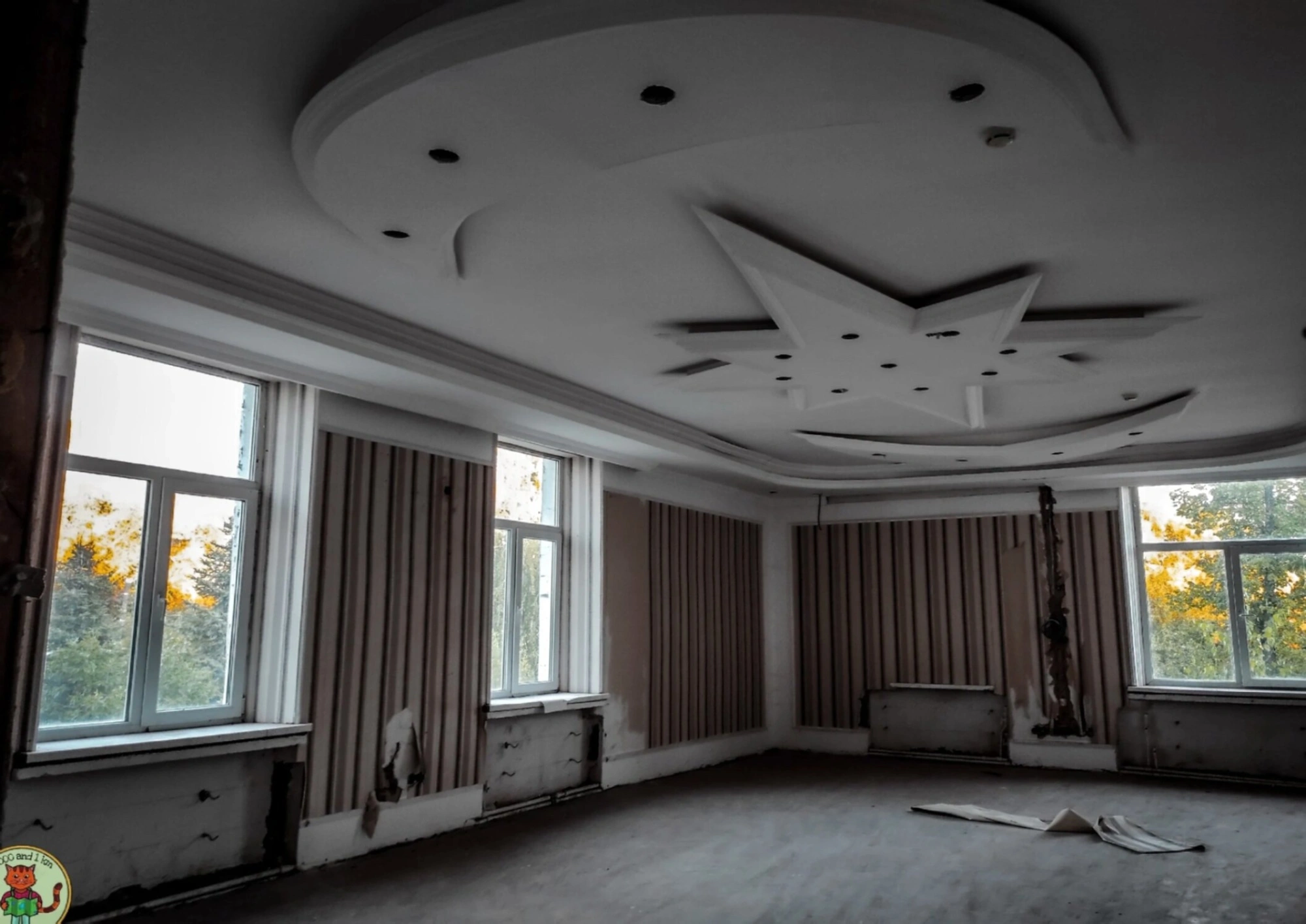 Интерьер заброшенного помещения отражает типичные черты общественных зданий советского периода: просторные помещения, высокие потолки и функциональную планировку. Отсутствие мебели и элементов декора подчёркивает длительный период запустения, при этом архитектурные детали сохраняют память о прежнем назначении этого строения.