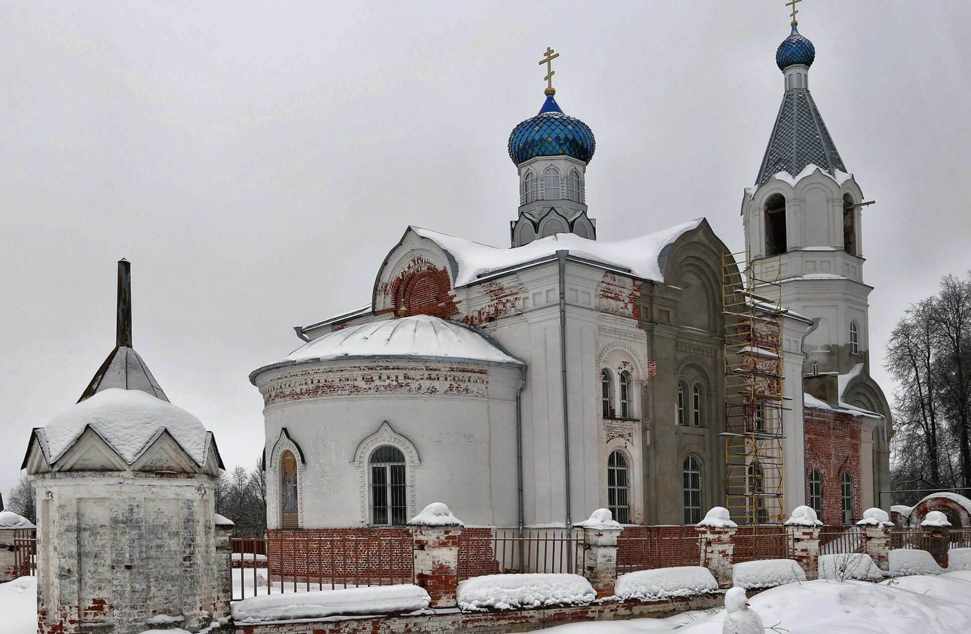 Фотография сделана в зимний период, о чем свидетельствует снежный покров, полностью укрывающий землю и соседние постройки. Снег придает особую атмосферу снимку, подчеркивая уединенность и спокойствие этого святого места. Рядом с основным зданием храма просматривается небольшая хозяйственная постройка, также покрытая снегом.