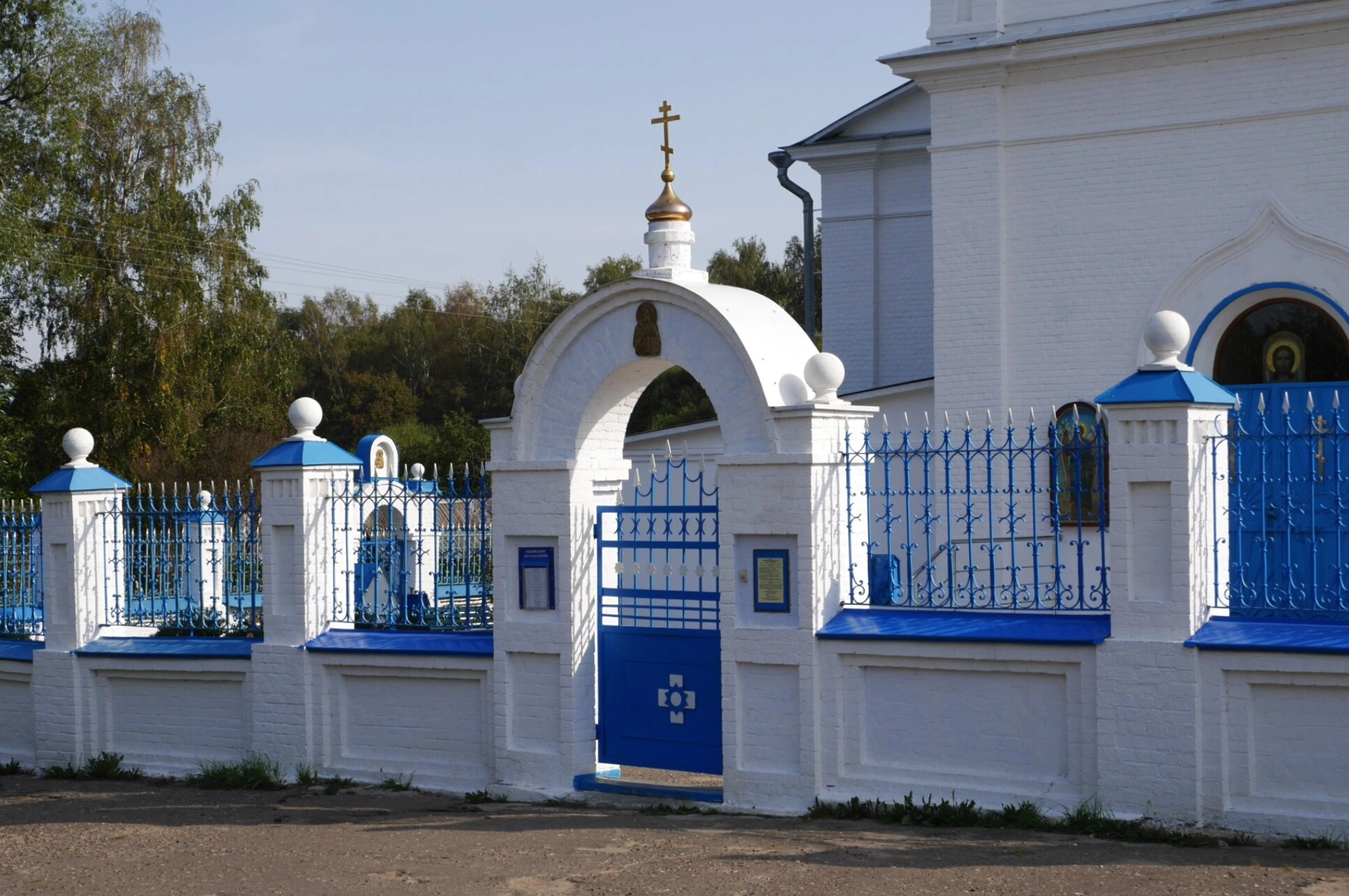 На фотографии запечатлена церковная ограда с центральной входной аркой Покровского храма в селе Воскресенки Ступинского района Московской области. Белоснежная кирпичная ограда с изящными синими решетками и столбами создает гармоничный архитектурный ансамбль с основным зданием церкви. Над арочным проемом, увенчанным золоченым крестом, возвышается главный купол храма.