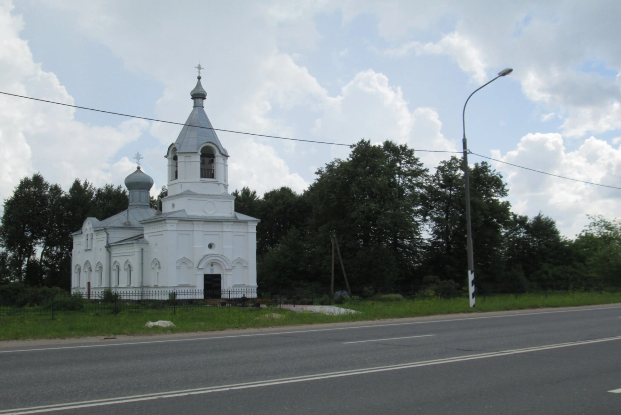 Святыня живописно расположена вблизи дороги, что исторически было характерно для погостов Новгородской земли. Храм окружён лиственными деревьями и скромной сельской растительностью, что создаёт ощущение уединённости и покоя. Над куполами простирается высокое облачное небо, напоминающее о божественном покровительстве этого святого места.