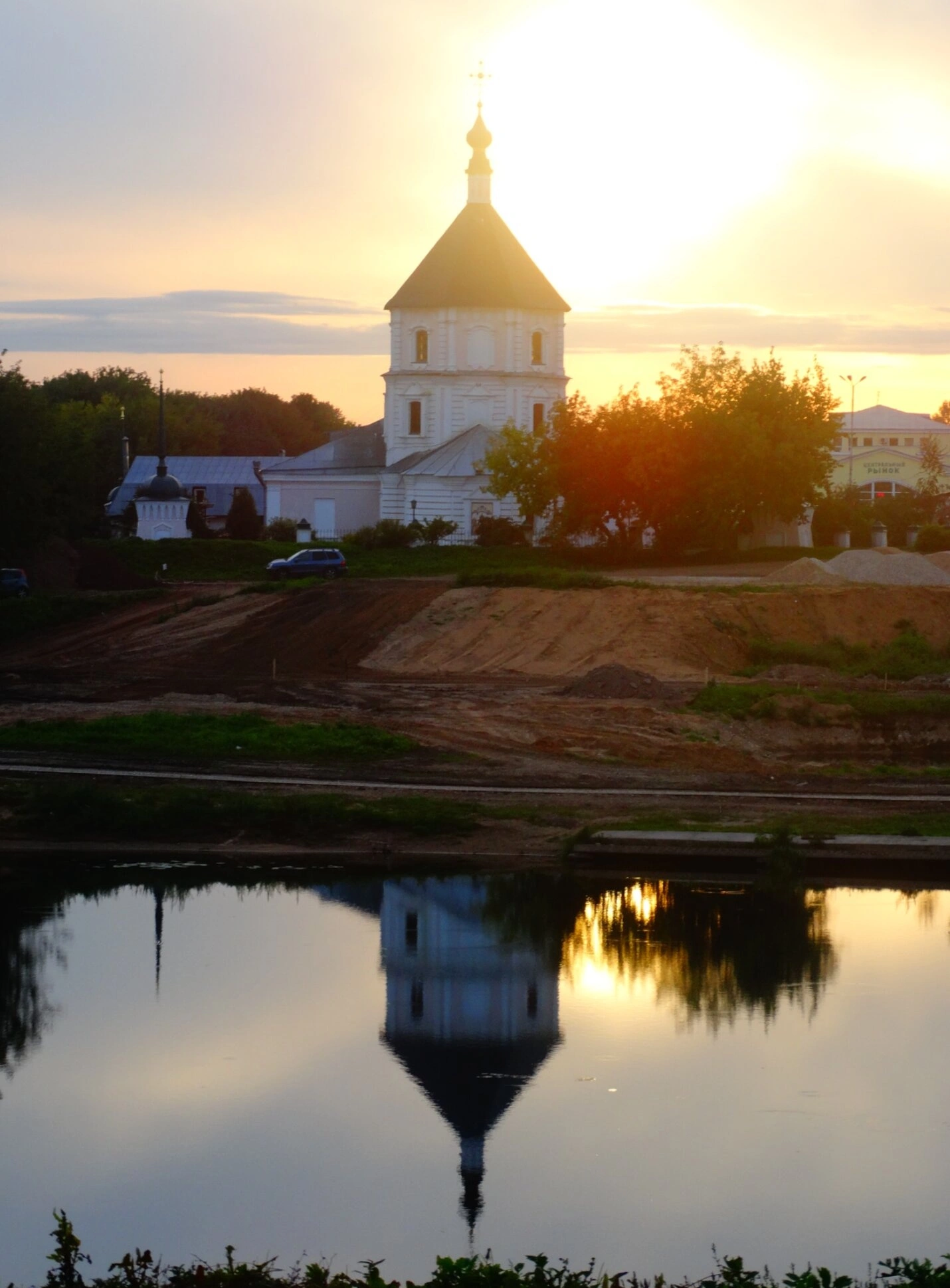 Данная фотография не просто фиксирует архитектурный объект, но передаёт глубокий символизм: Церковь Божия, стоящая на твердом основании, отражается в водной глади, что символически напоминает о соединении земного и небесного, о стремлении человеческой души к своему Первообразу. Закатное солнце, расположенное за храмом, воспринимается как образ света истины, который проистекает от веры и озаряет весь мир вокруг.