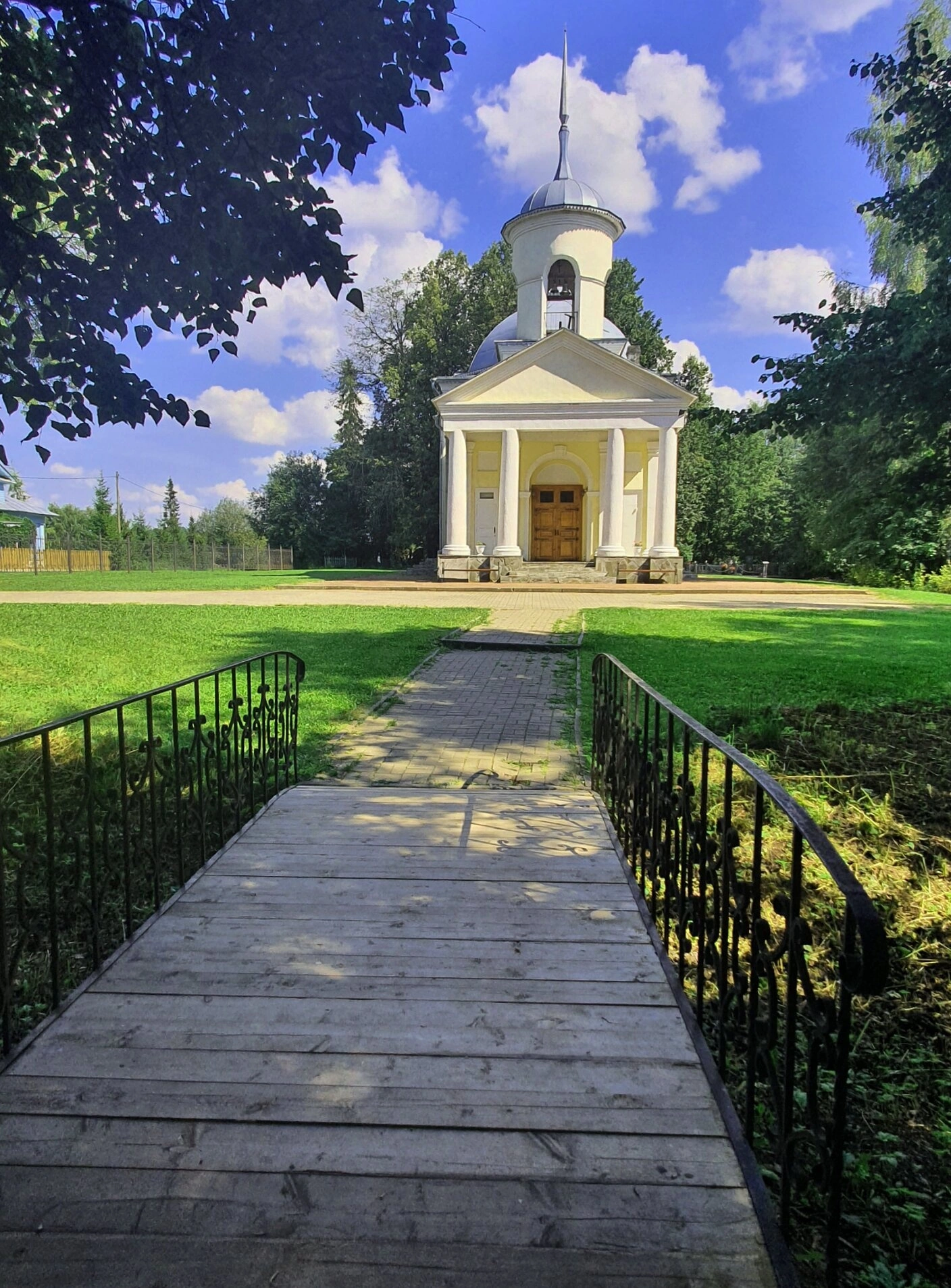 На переднем плане фотографии виден деревянный мостик с ажурными коваными перилами, перекинутый через живописный овраг. Этот архитектурный элемент придает композиции особую глубину и символическую значимость — как переход от мирской суеты к духовному сосредоточению. Мостик ведет непосредственно к храму, приглашая верующих к молитве и богомыслию.