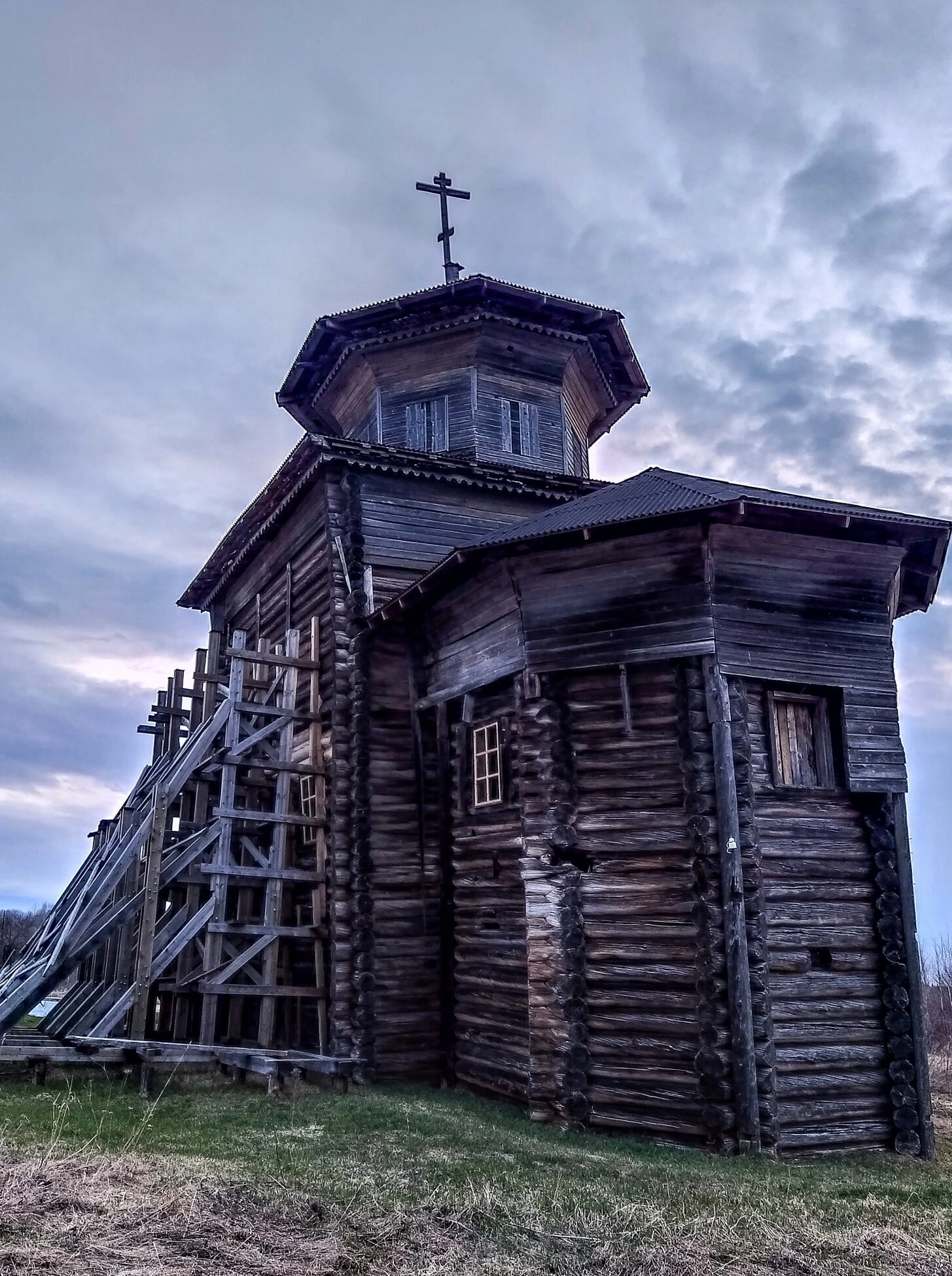 На фотографии запечатлена Церковь Покрова Пресвятой Богородицы, расположенная в посёлке Усть-Ваеньга Виноградовского района Архангельской области. Этот уникальный памятник русского деревянного зодчества был возведён в период с 1802 по 1809 год на месте более древних деревянных храмов. Трёхпрестольный храм освящён в честь Покрова Пресвятой Богородицы, его северный придел посвящён святому Алексию, человеку Божию, а южный — святителям Афанасию и Кириллу Александрийским.