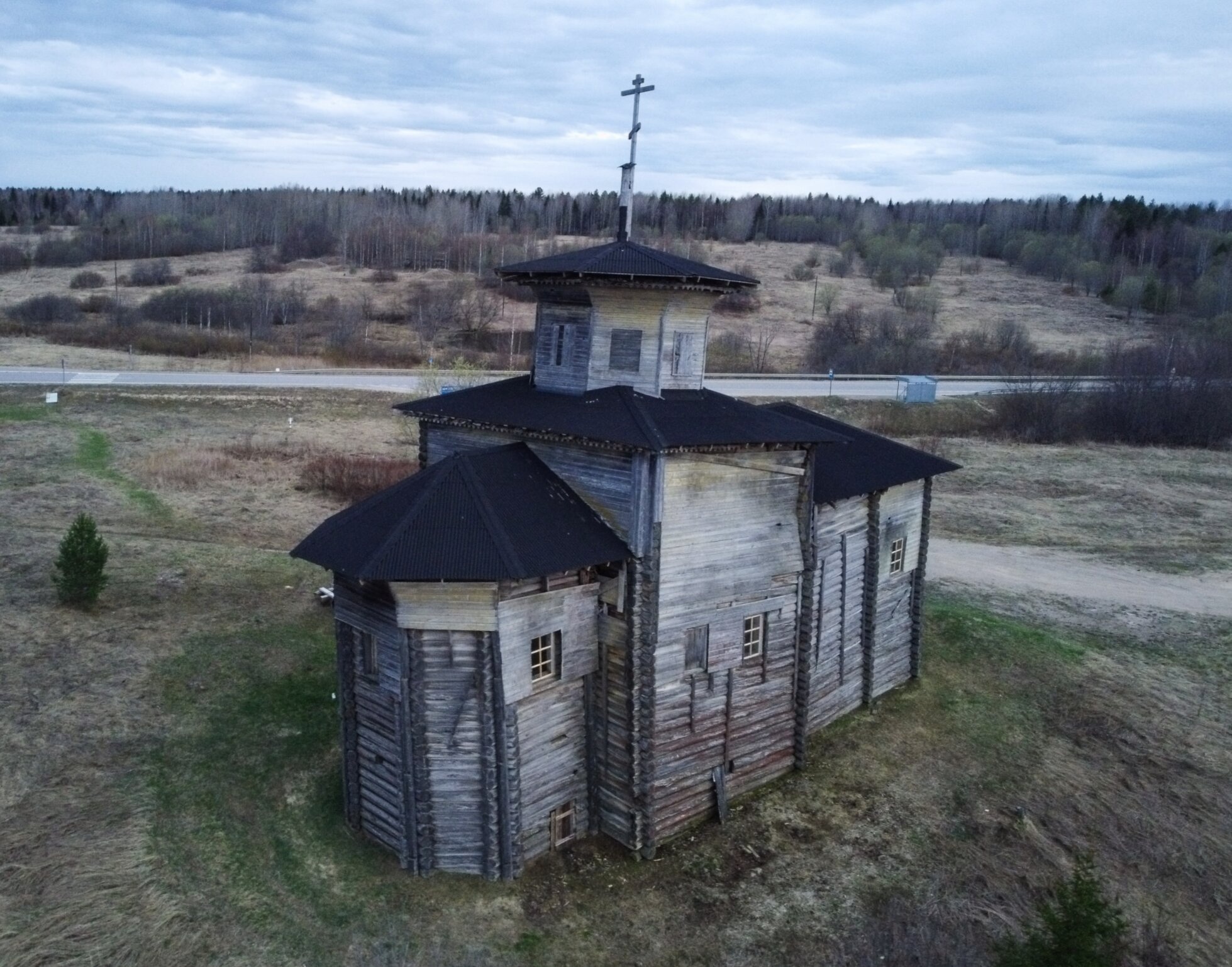 На фотографии запечатлена Церковь Покрова Пресвятой Богородицы, расположенная в селе Усть-Ваеньга Виноградовского района Архангельской области. Этот храмовый комплекс является уникальным памятником архитектуры начала XIX века, сохранившимся до наших дней на живописном берегу Северной Двины.