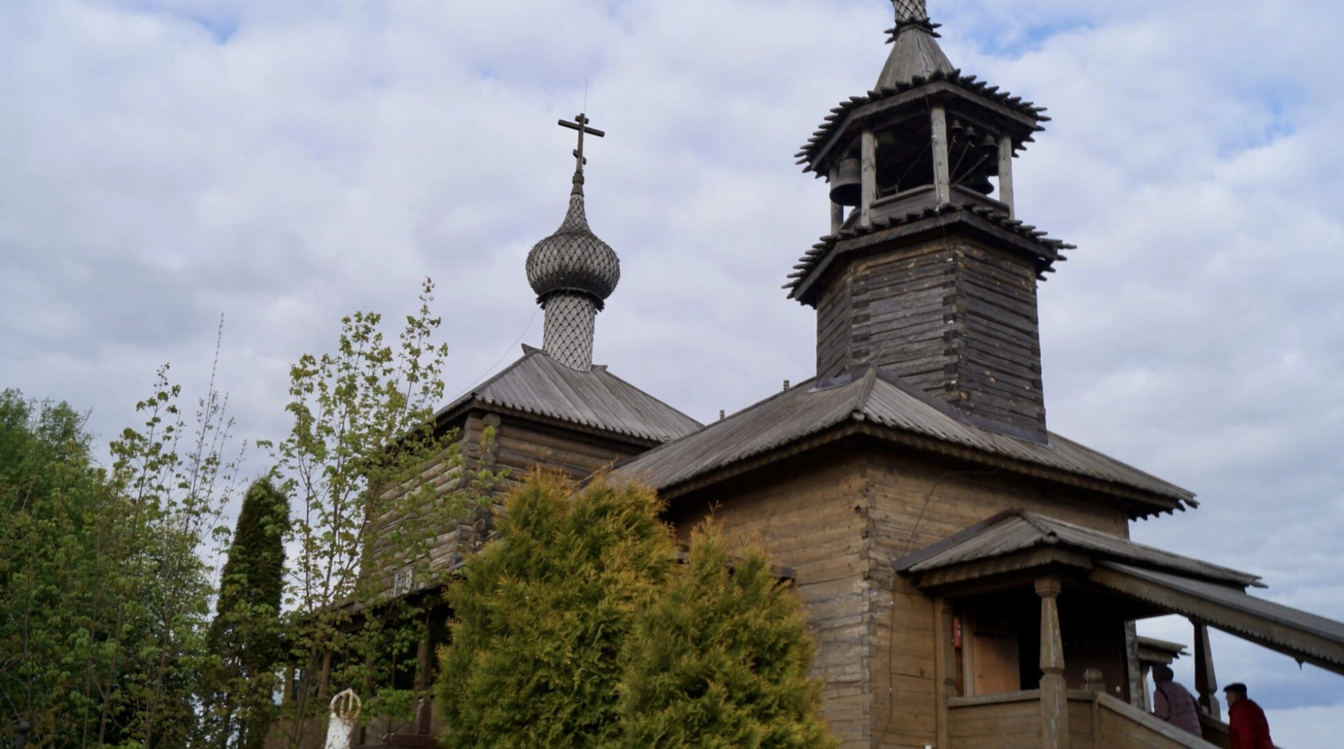 Архитектура церкви представляет собой классический образец клетского храма, характерного для русского Севера и центральных регионов. Главной особенностью святыни является то, что она была срублена из добротного леса без использования единого железного гвоздя, по древней технологии предков. Все соединения выполнены с помощью искусных плотницких замков и врубок. На снимке хорошо просматривается мощный сруб, увенчанный аккуратным куполом-луковкой, который венчает Святой Животворящий Крест Господень.