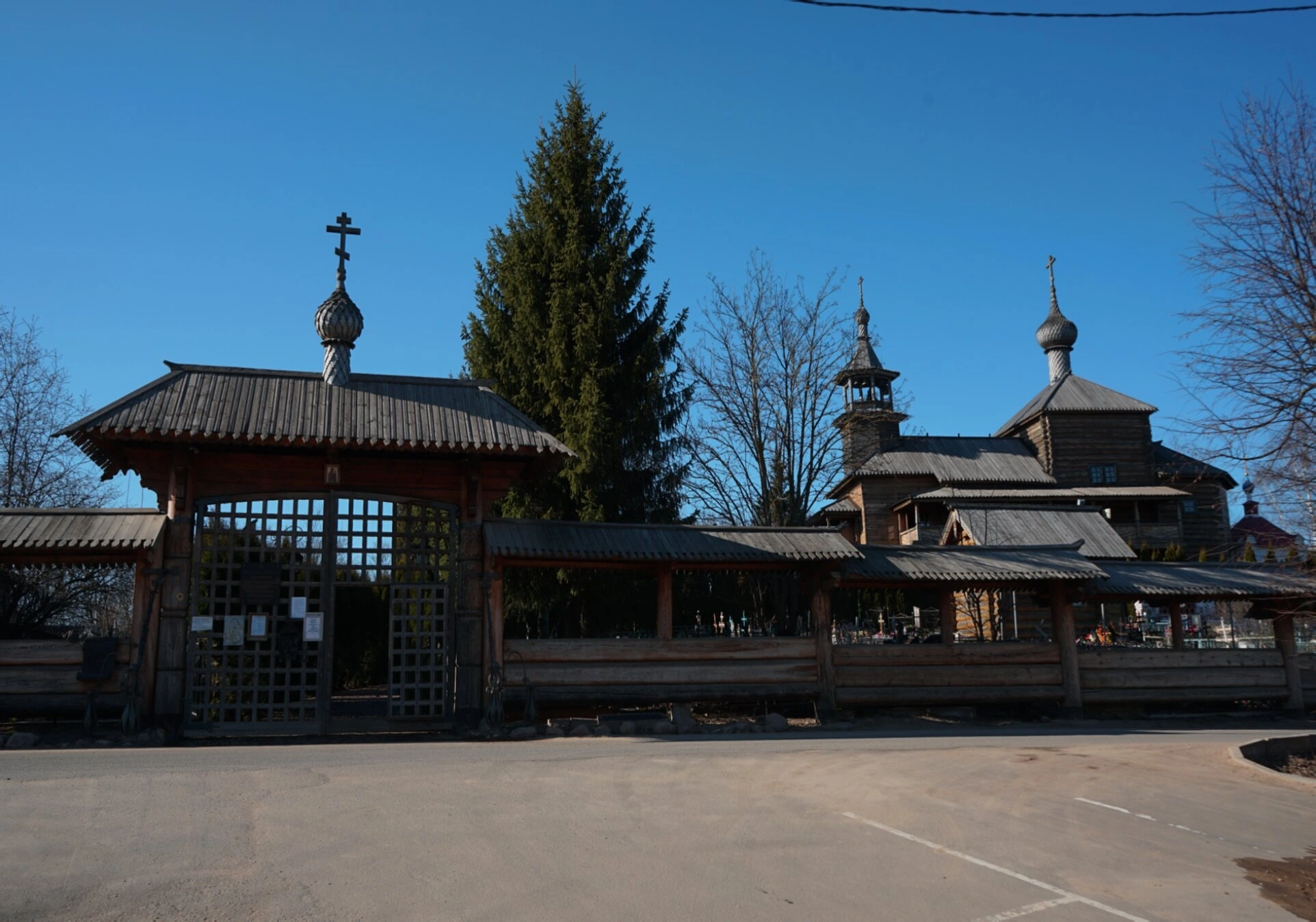 Деревянные строения ансамбля, включающие, вероятно, часовню либо вспомогательные постройки, являют характерные для русского севера приёмы плотницкого мастерства: срубную конструкцию из необтёсанных брёвен, искусную резьбу на конструктивно значимых элементах и гармоничное единство с окружающим природным ландшафтом . Чистое голубое небо на фоне подчёркивает величие творения рук человеческих, возведённого во славу Божию.