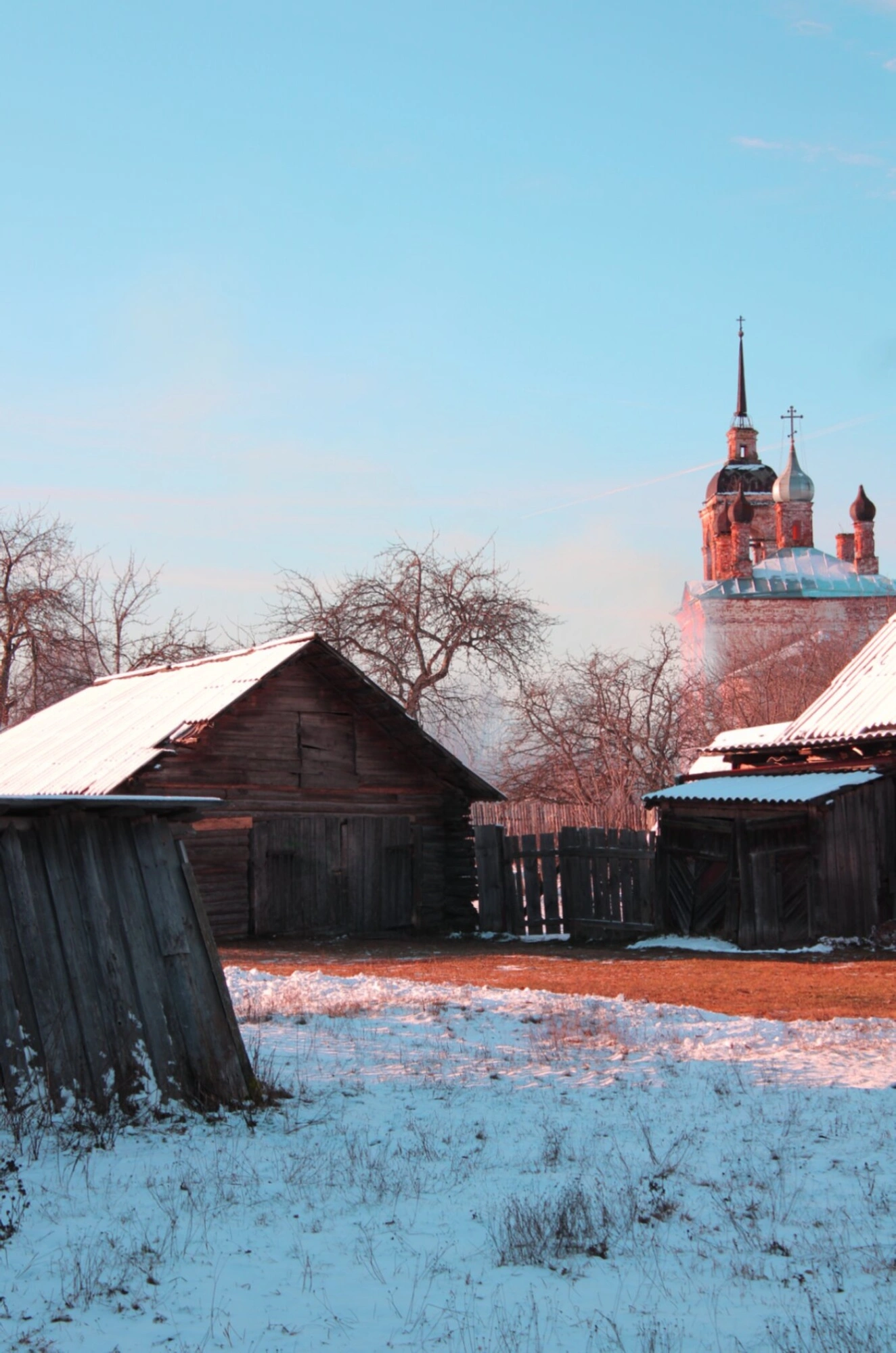 Доминантой композиции выступает сама Покровская церковь, чьи устремлённые в небо купола и шпиль символизируют молитвенное горение к Богу. Чистое голубое небо в этот ясный зимний день освещает золотые главки храма, создавая светоносный эффект. Архитектура церкви характерна для северного православного зодчества, демонстрируя гармонию пропорций и глубокую символику православной веры.