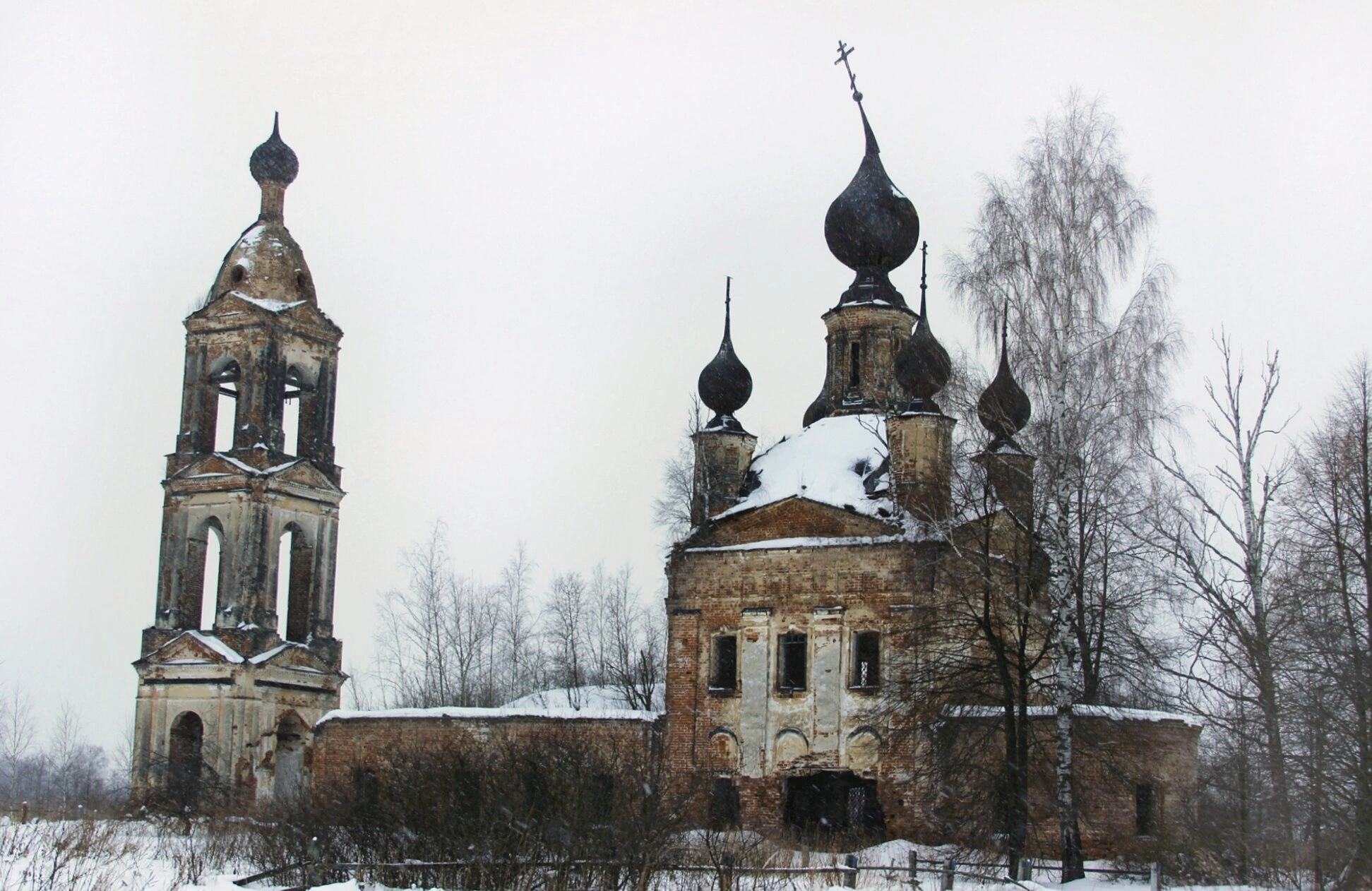 На представленной фотографии запечатлена Церковь Покрова Пресвятой Богородицы, расположенная в урочище Ширинье Ярославской области. Храм находится в полуразрушенном состоянии, что придает ему особое духовное звучание как памятника ушедшей эпохи.