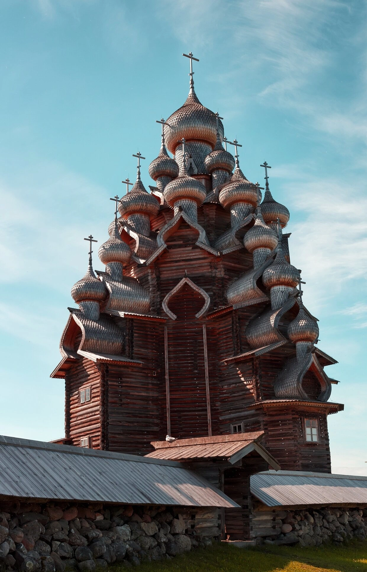 На фотографии запечатлена Церковь Преображения Господня, являющаяся центральным сооружением Кижского погоста на одноимённом острове в Онежском озере. Этот православный храм, возведённый в 1714 году, представляет собой вершину русского деревянного зодчества и с 1990 года входит в список Всемирного наследия ЮНЕСКО.