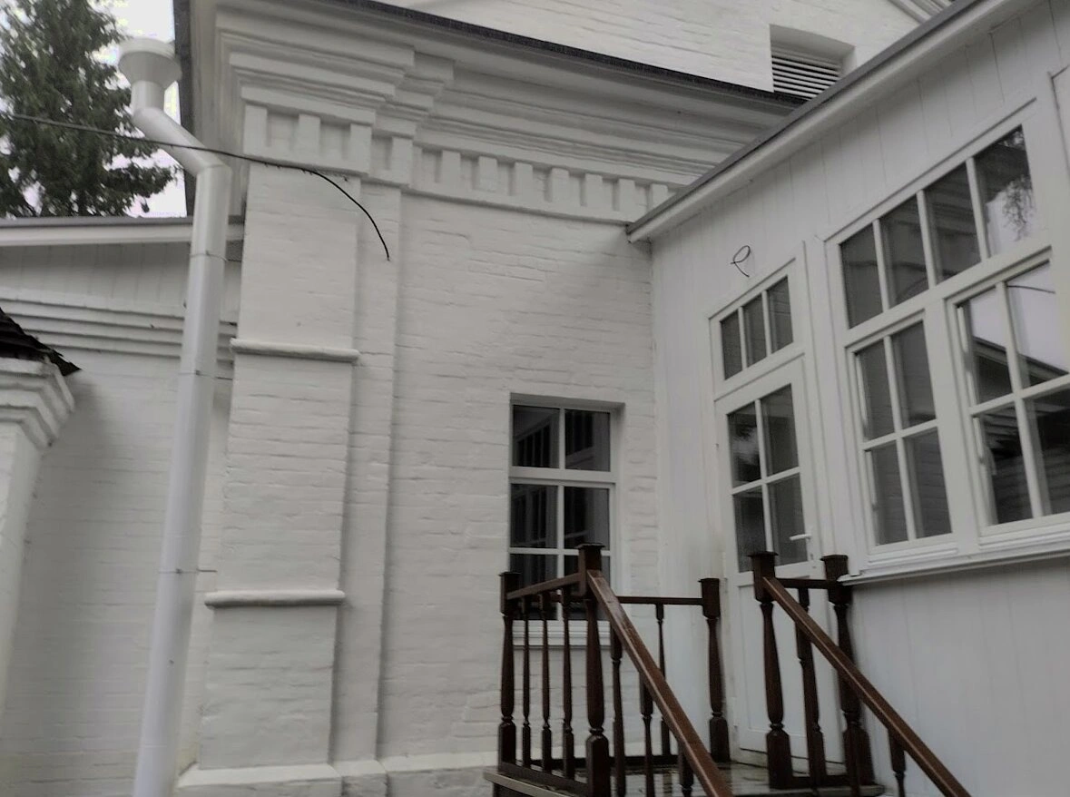 Архитектурная композиция включает два различных оконных проема: небольшое окно с классической белой рамой в кирпичной стене и более масштабный оконный комплекс, вероятно относящийся к более поздней пристройке. Деревянное крыльцо с темно-коричневыми перилами, расположенное в центре кадра, придает сооружению особое тепло и гостеприимство, характерное для русских храмов.