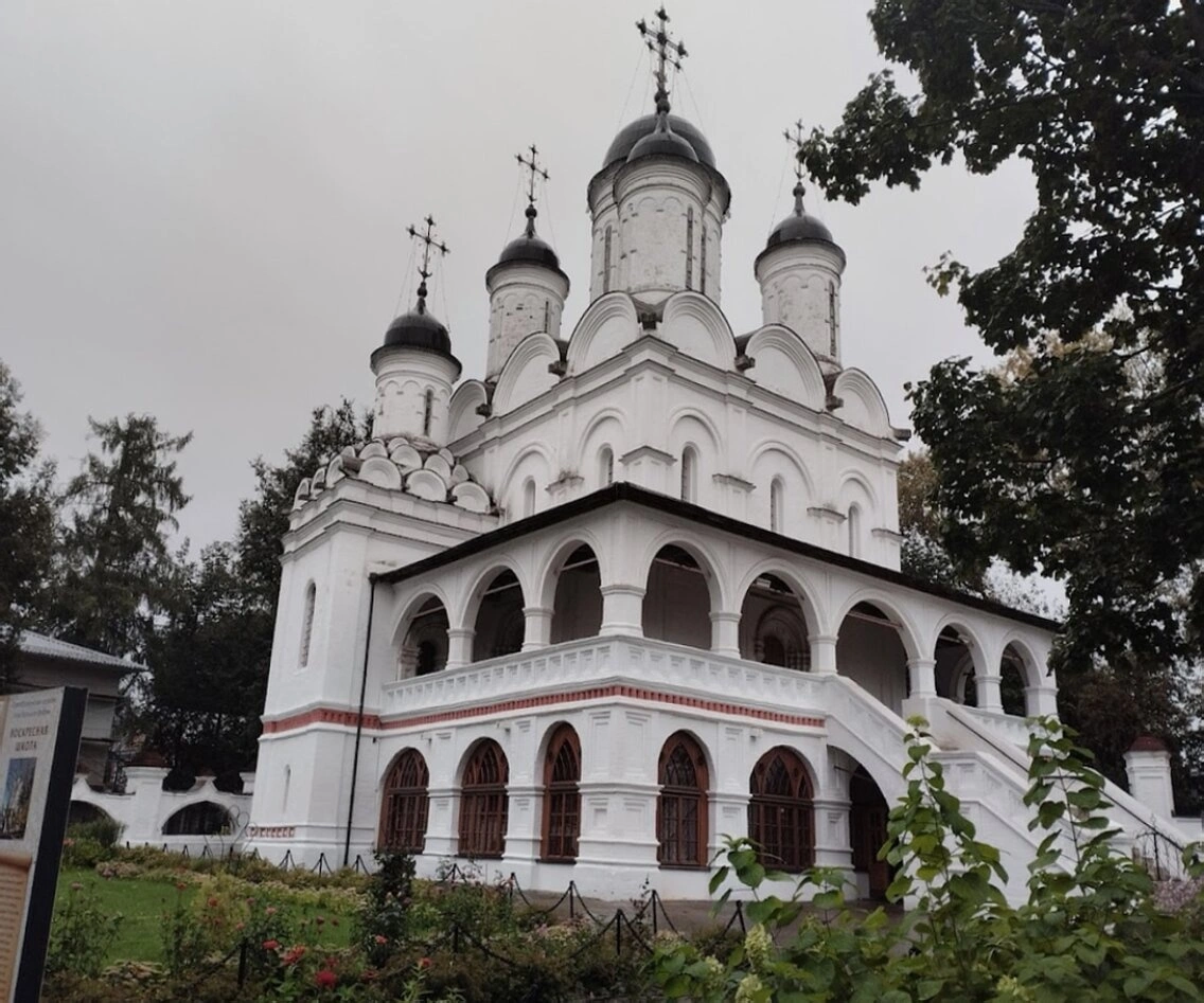 На фотографии запечатлен величественный образ Церкви Преображения Господня, расположенной в историческом посёлке Большие Вязёмы Московской области. Этот православный храм, возведённый в конце XVI века по повелению царя Бориса Годунова, представляет собой выдающийся памятник древнерусского зодчества.