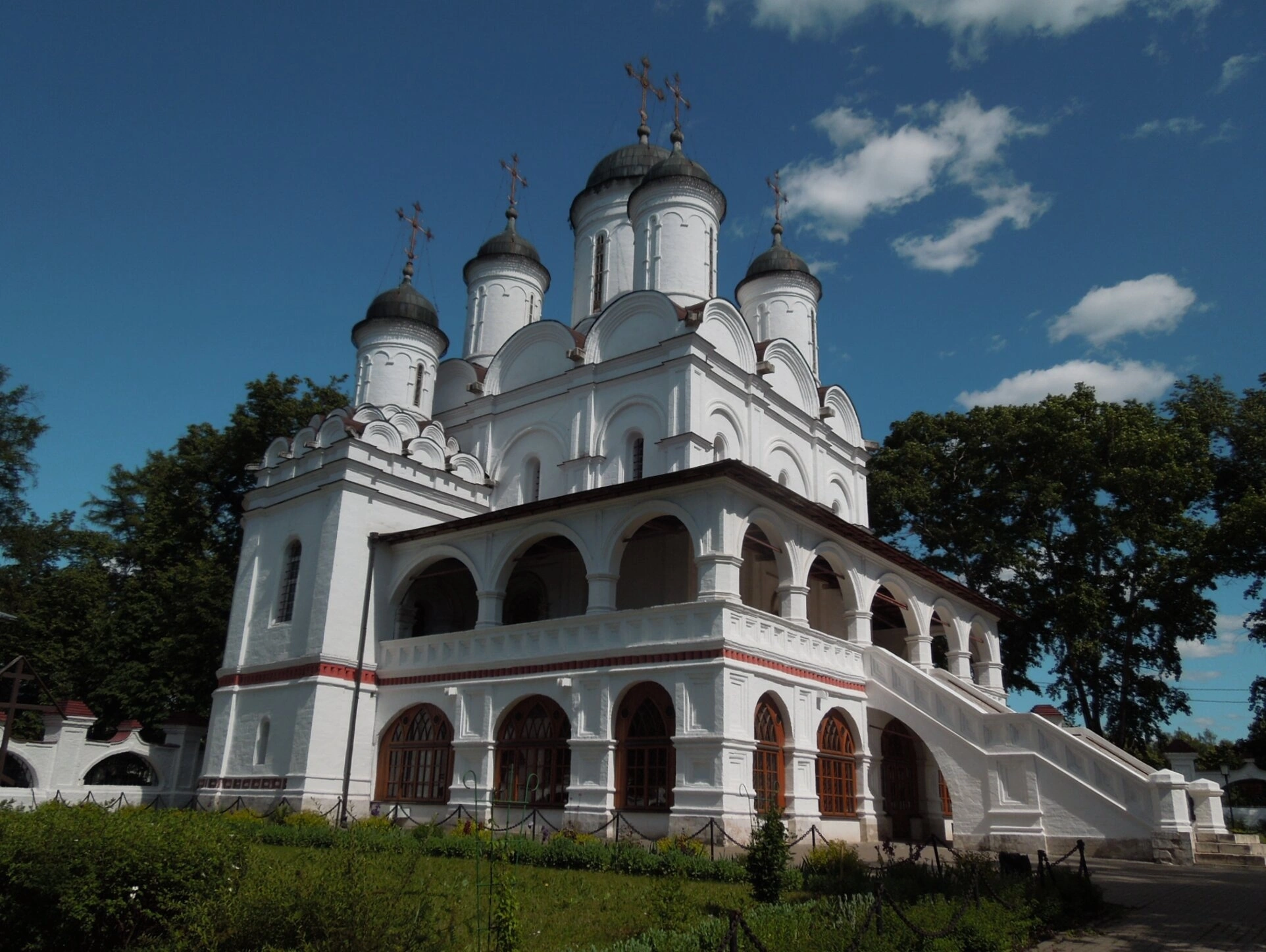 На представленной фотографии запечатлена Церковь Преображения Господня, расположенная в селе Большие Вязёмы Одинцовского городского округа Московской области. Этот уникальный православный храм был возведён в конце XVI века по повелению царя Бориса Годунова и является выдающимся памятником древнерусского зодчества.