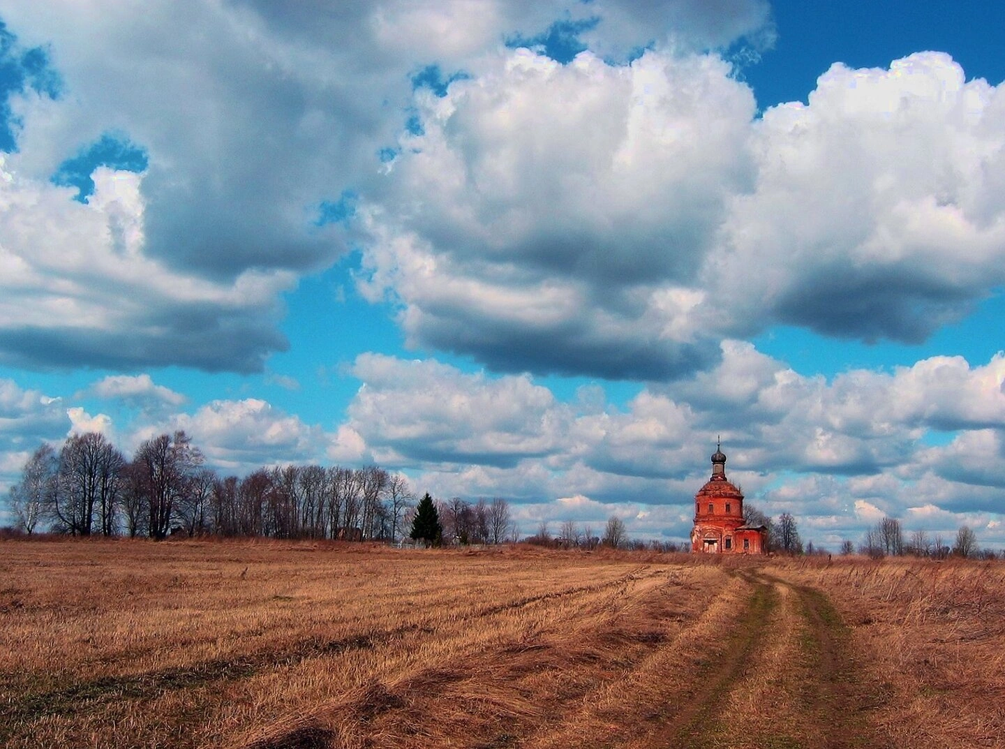 Церковь располагается посреди открытого поля, покрытого сухой жёлтой травой, что указывает на осенний период съёмки. К храмовому зданию ведёт грунтовая дорога, а на заднем плане виднеются деревья, лишённые листвы. Небесный свод представлен голубым фоном с величественными кучевыми облаками, создающими торжественное настроение.