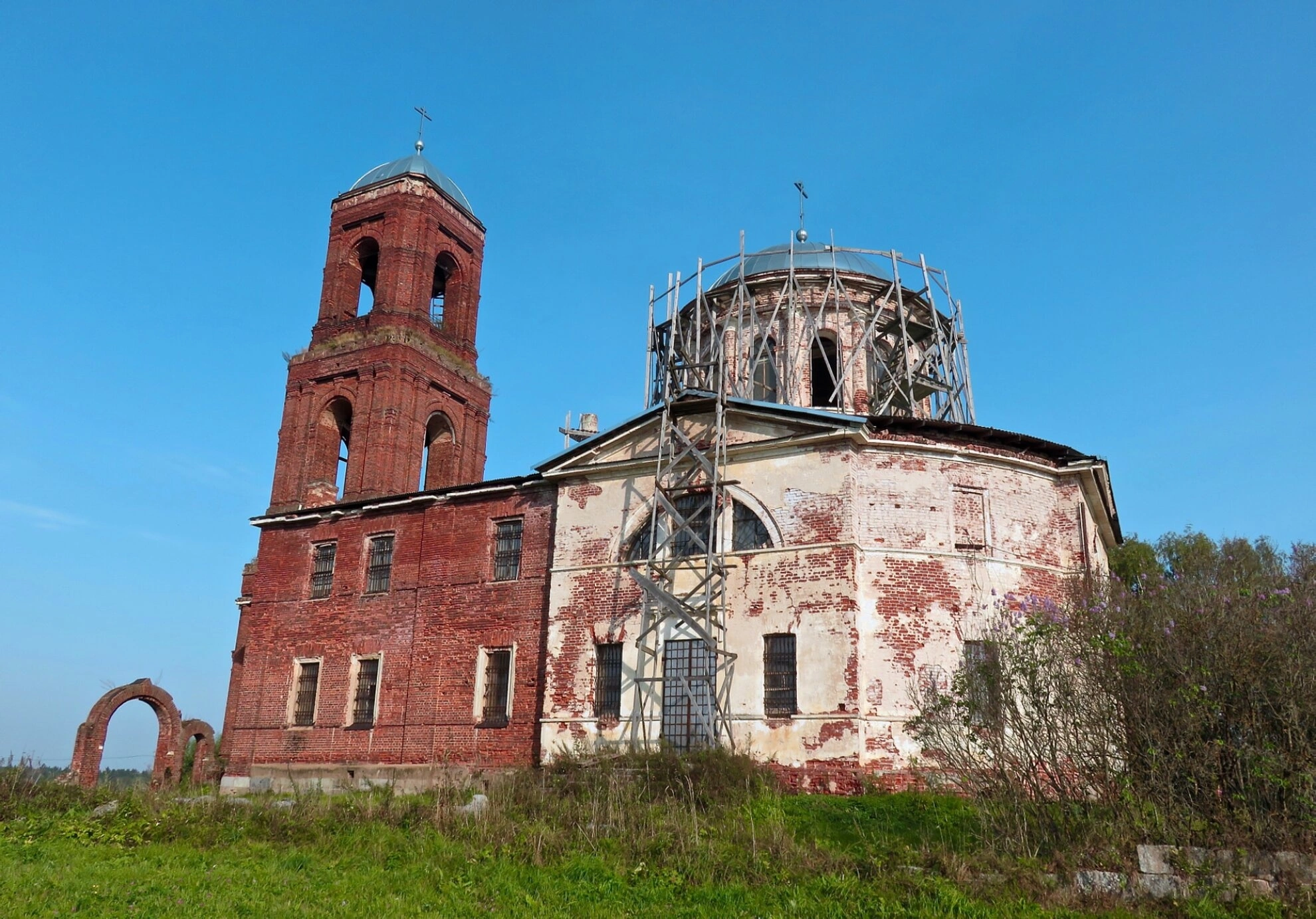 Нынешнее состояние храма вызывает одновременно скорбь и надежду. С одной стороны, видны следы разрушения: утрачена большая часть кровли, обнажившись кирпичная кладка сводов, местами повреждены карнизы и оконные проёмы. С другой стороны, наличие строительных лесов вокруг барабана главки свидетельствует о начавшихся работах по консервации или реставрации, что вселяет веру в возможное возрождение святыни.