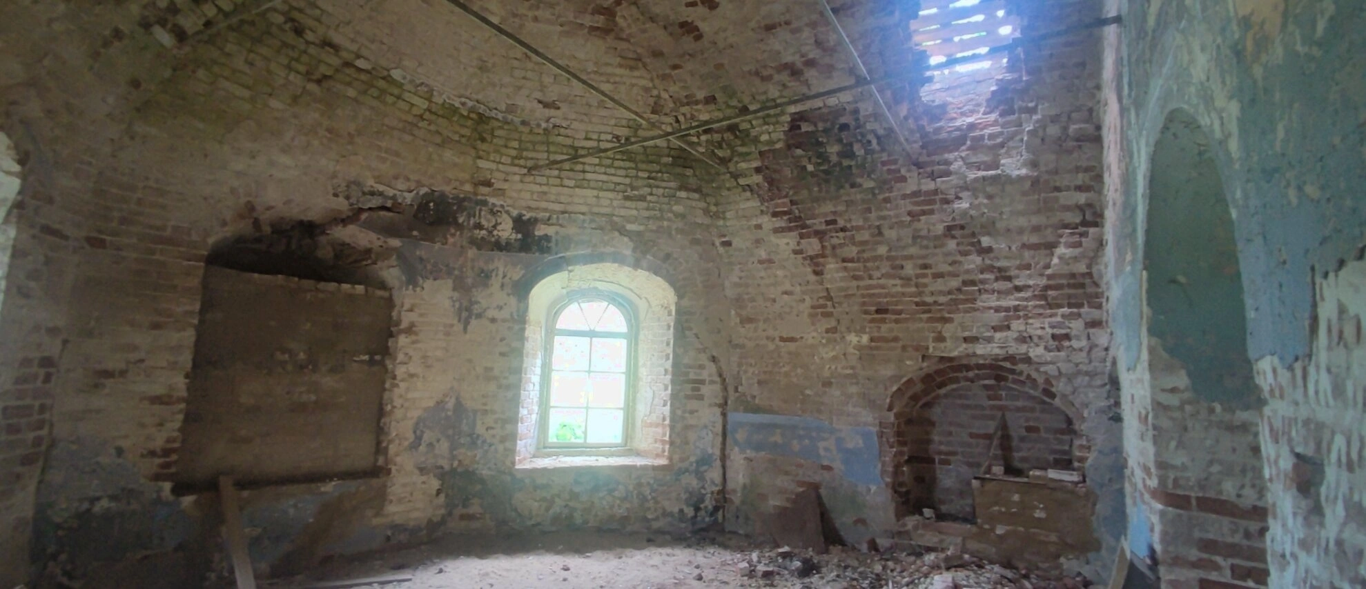 К сожалению, в годы гонений на Церковь в XX веке храм был закрыт и постепенно пришёл в запустение. Со временем исчезла и сама деревня Столпино, оставив после себя лишь этот молчаливый каменный свидетель былой веры и благочестия. На снимке видны остатки мощных стен, сводчатые конструкции и оконные проёмы, сквозь которые ныне прорастает деревья, символизируя торжество природы над творением рук человеческих.